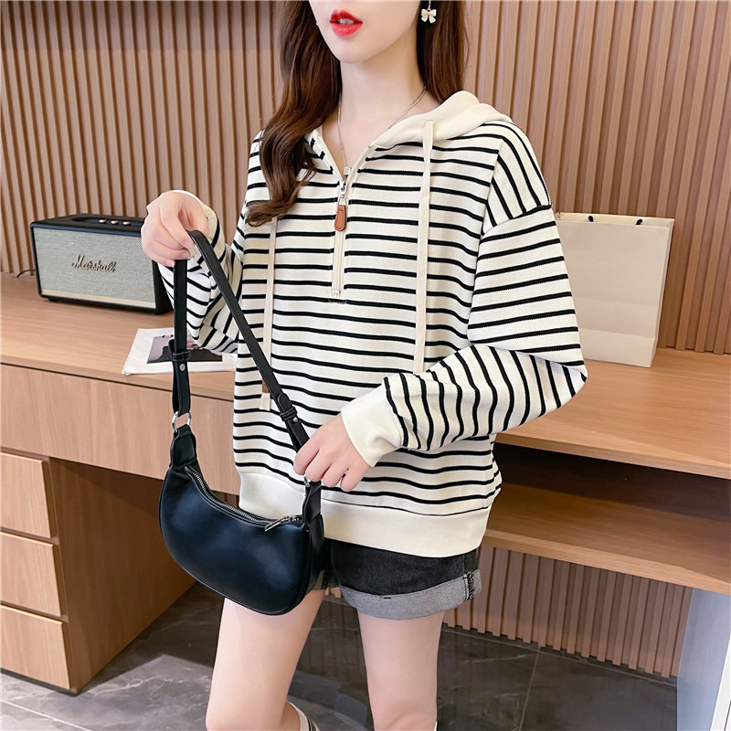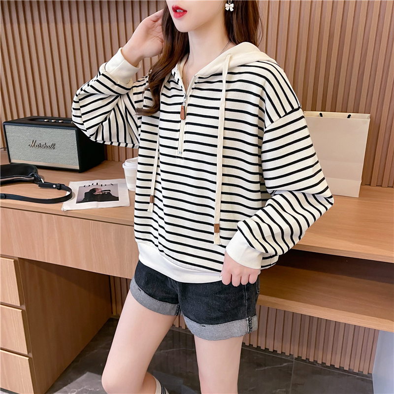 宽松设计感小个子条纹连帽卫衣女