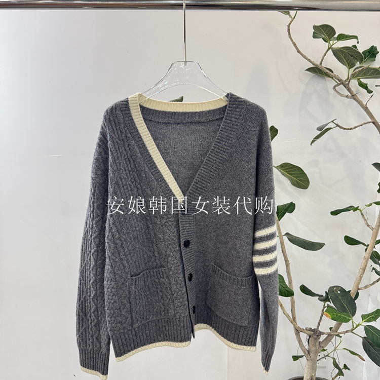 安娘韩国代购东大门女装2025冬新V领拼色条纹单排扣口袋针织开衫