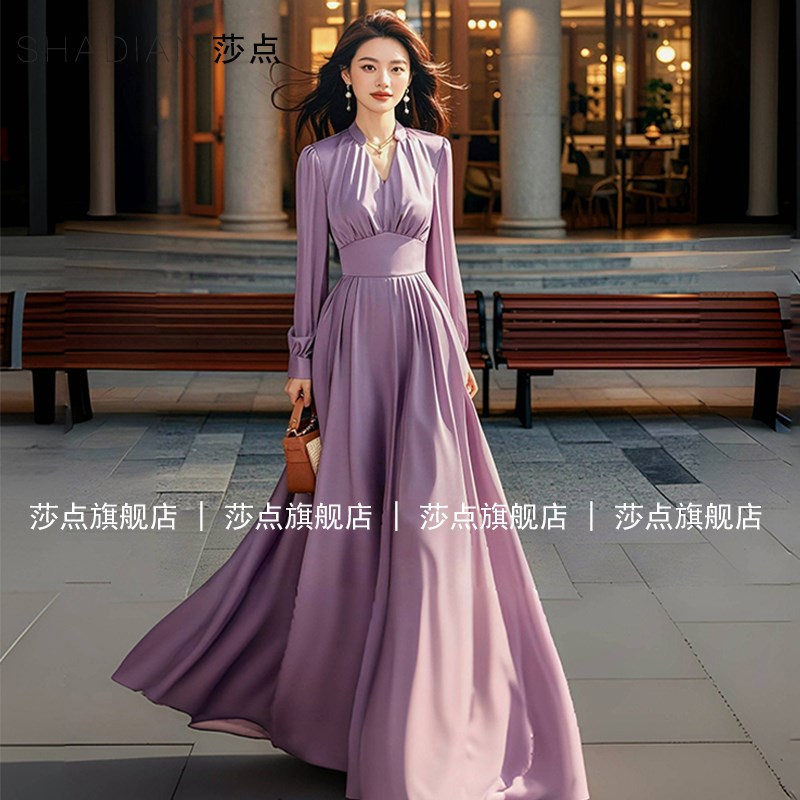 紫色连衣裙收腰显瘦大摆裙V领衬衫袖名媛气质高级感缎面长裙