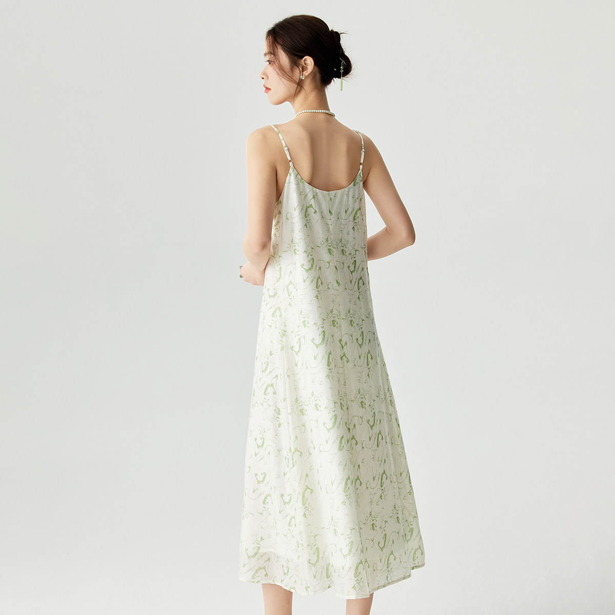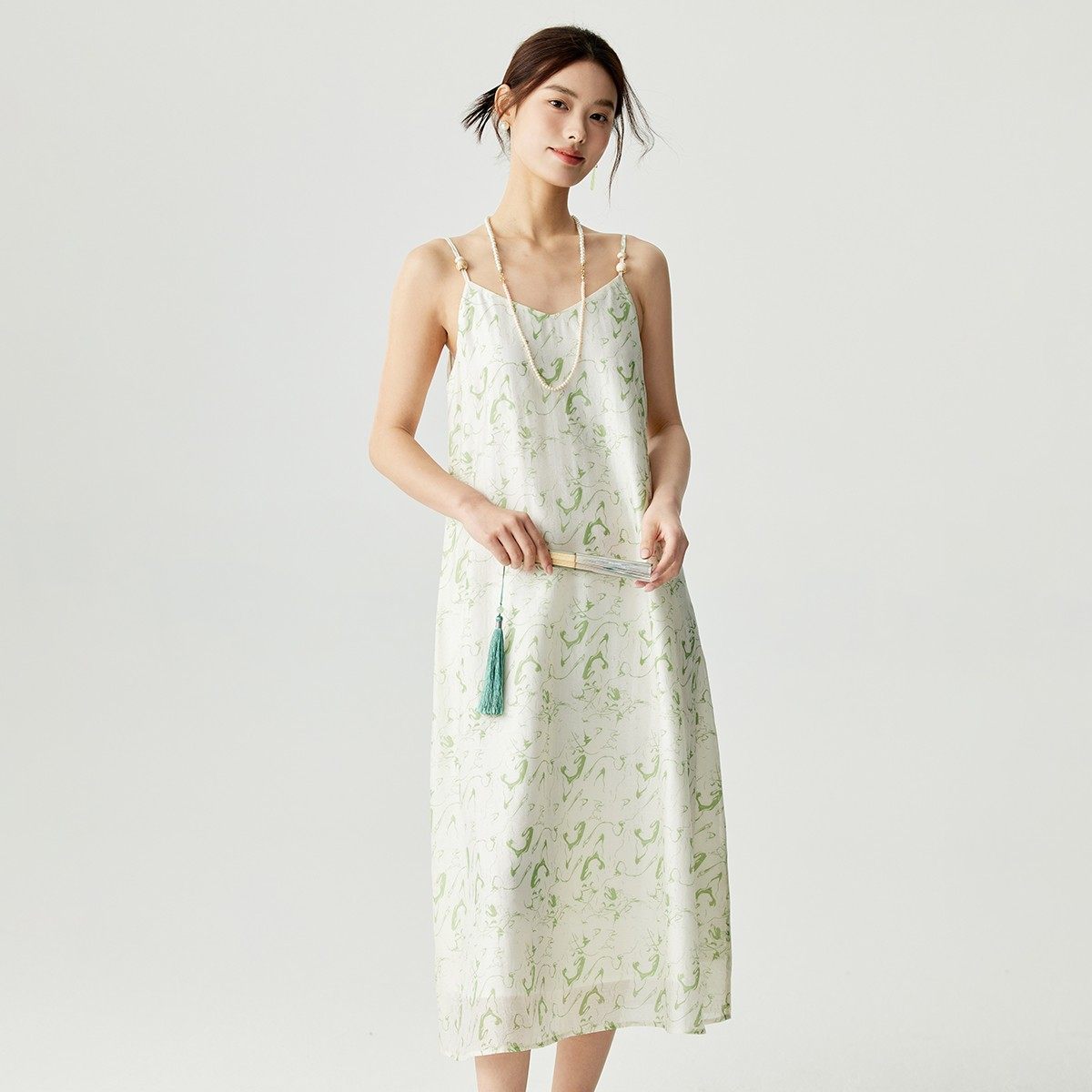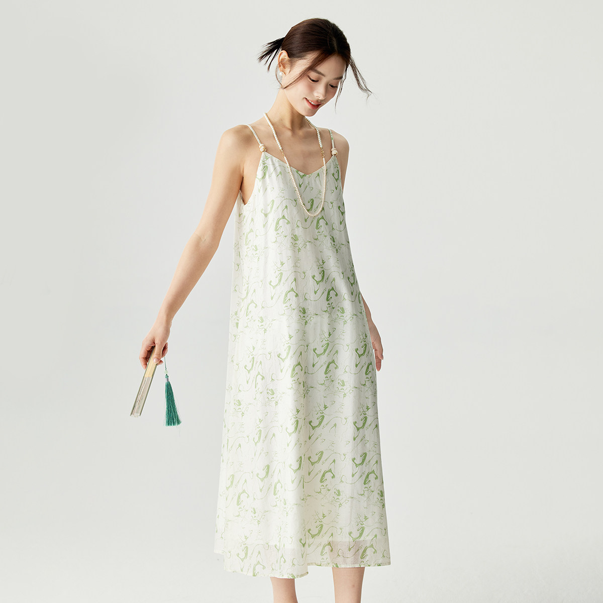 茵曼莱赛尔天丝新中式吊带连衣裙女2025夏季国风碎花A字背心长裙