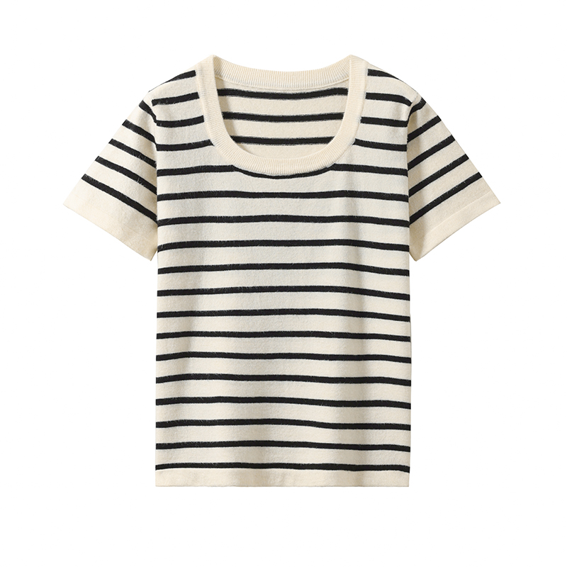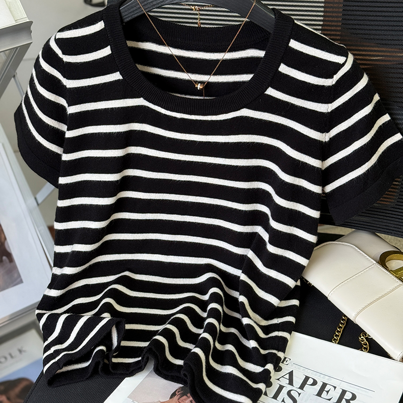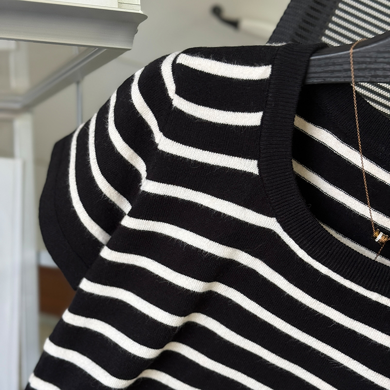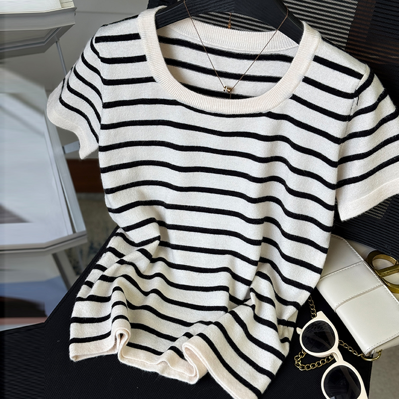 安迪绒时尚针织衫2025春夏新款女装简约圆领修身短袖撞色条纹上衣