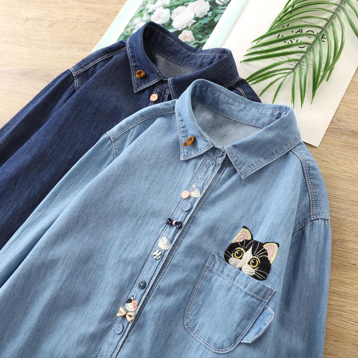 学院风口袋猫头门襟刺绣牛仔长袖衬衫女2025春秋新款童趣宽松上衣