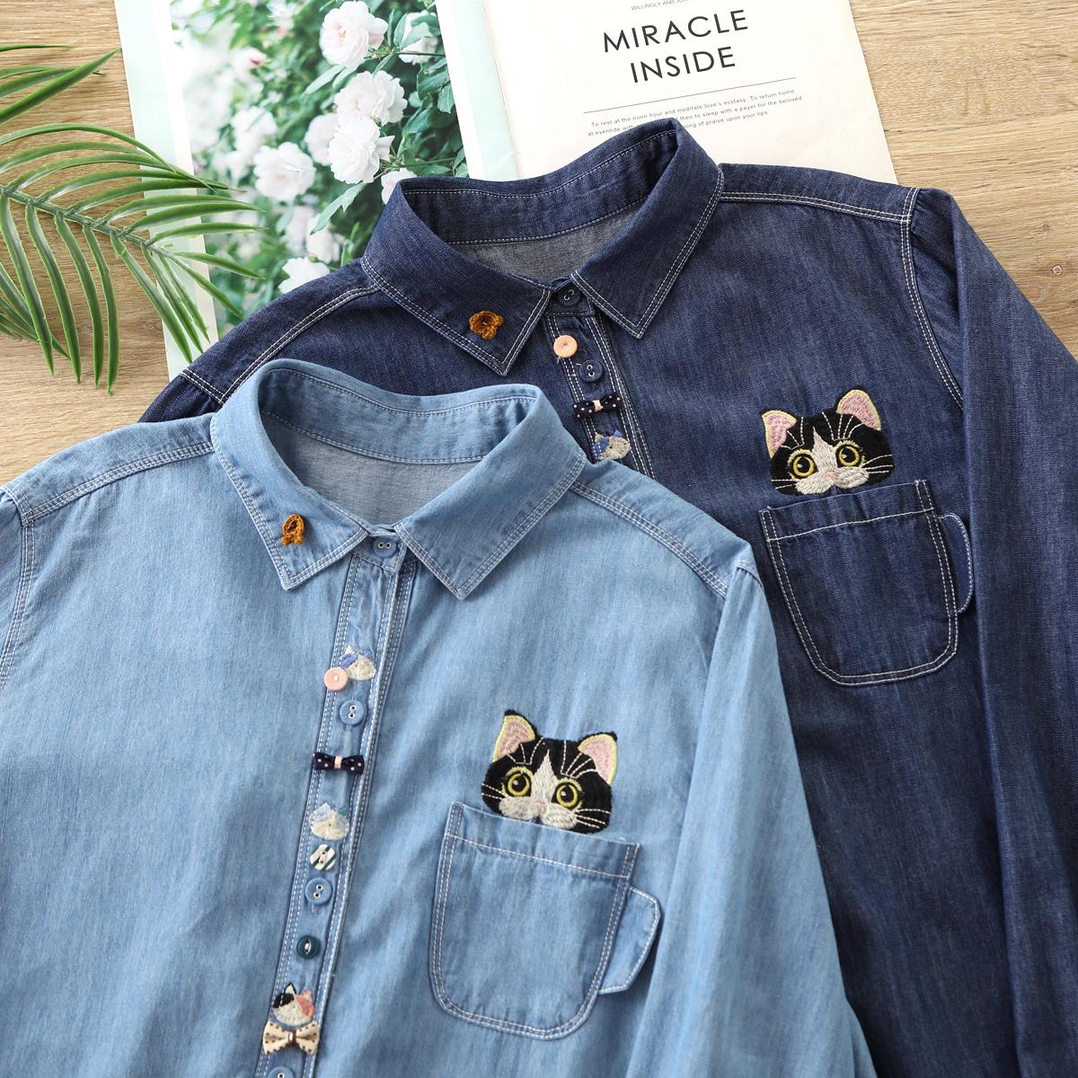 袖志口袋猫头门襟刺绣牛仔衬衫