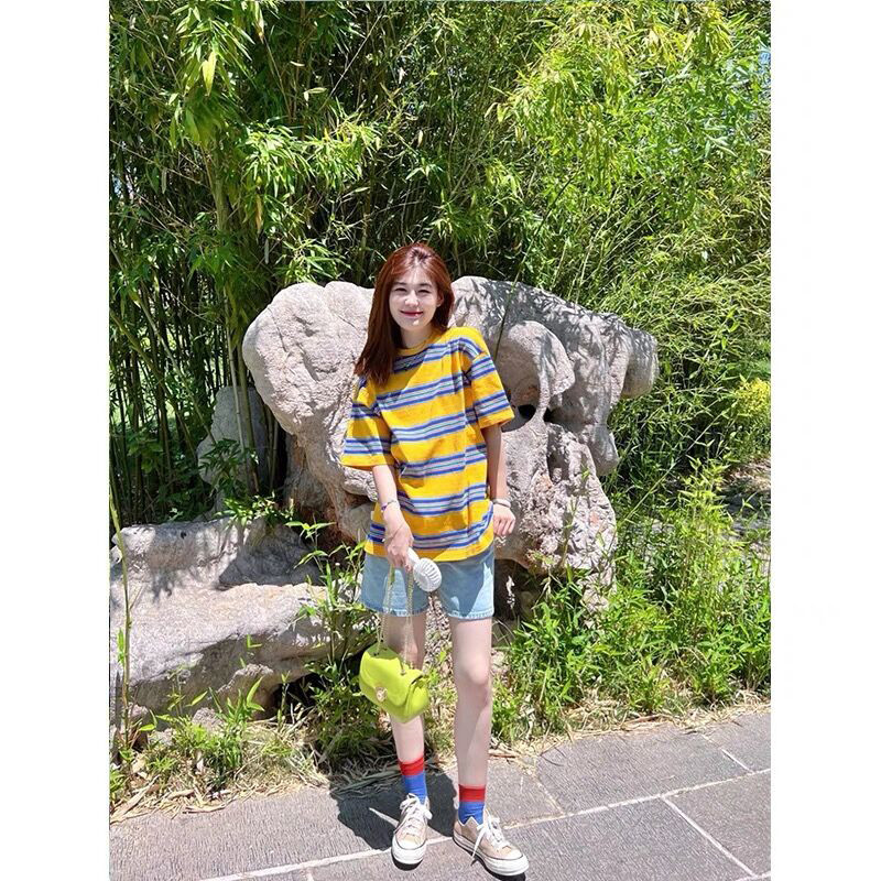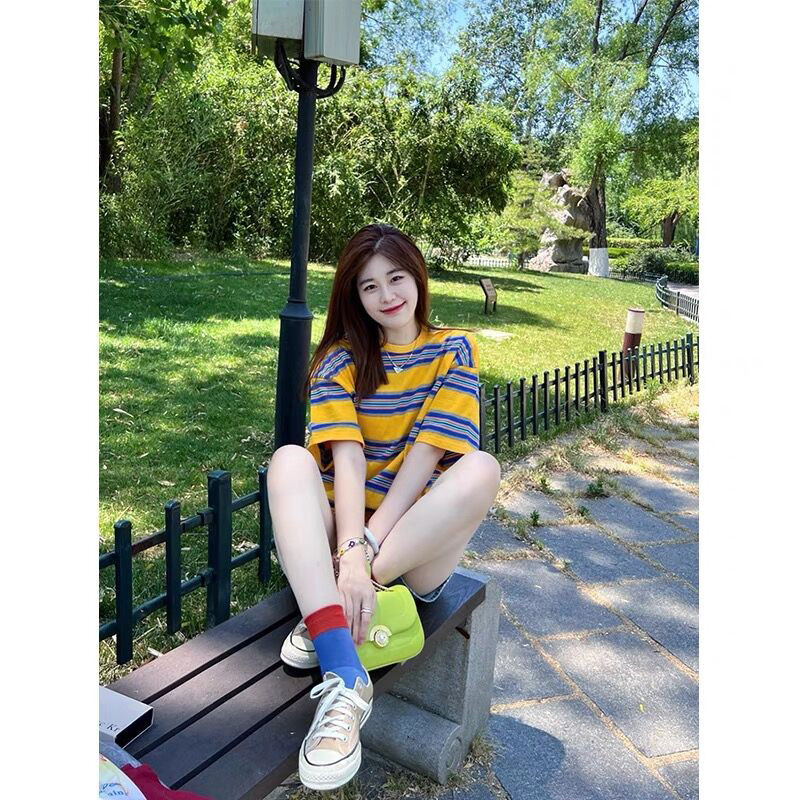 2025夏季新款美式复古条纹短袖T恤女宽松ins超火撞色条纹半袖上衣