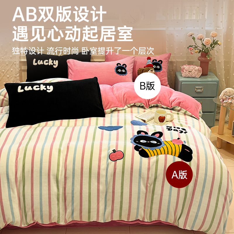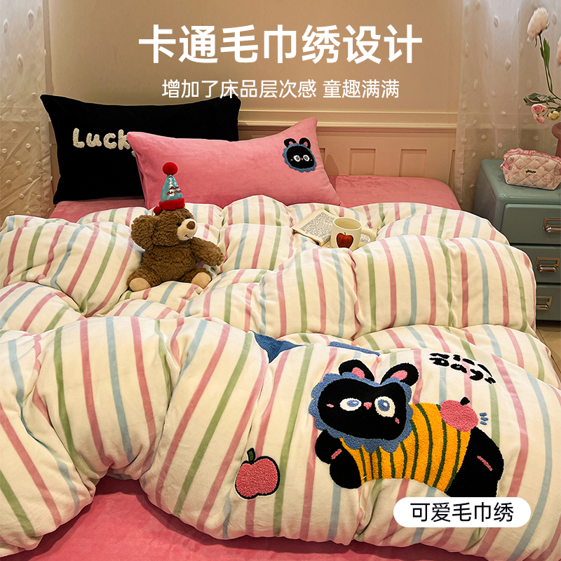 无印良品卡通牛奶绒毛巾绣四件套床品儿童被套床单冬季床上三件套