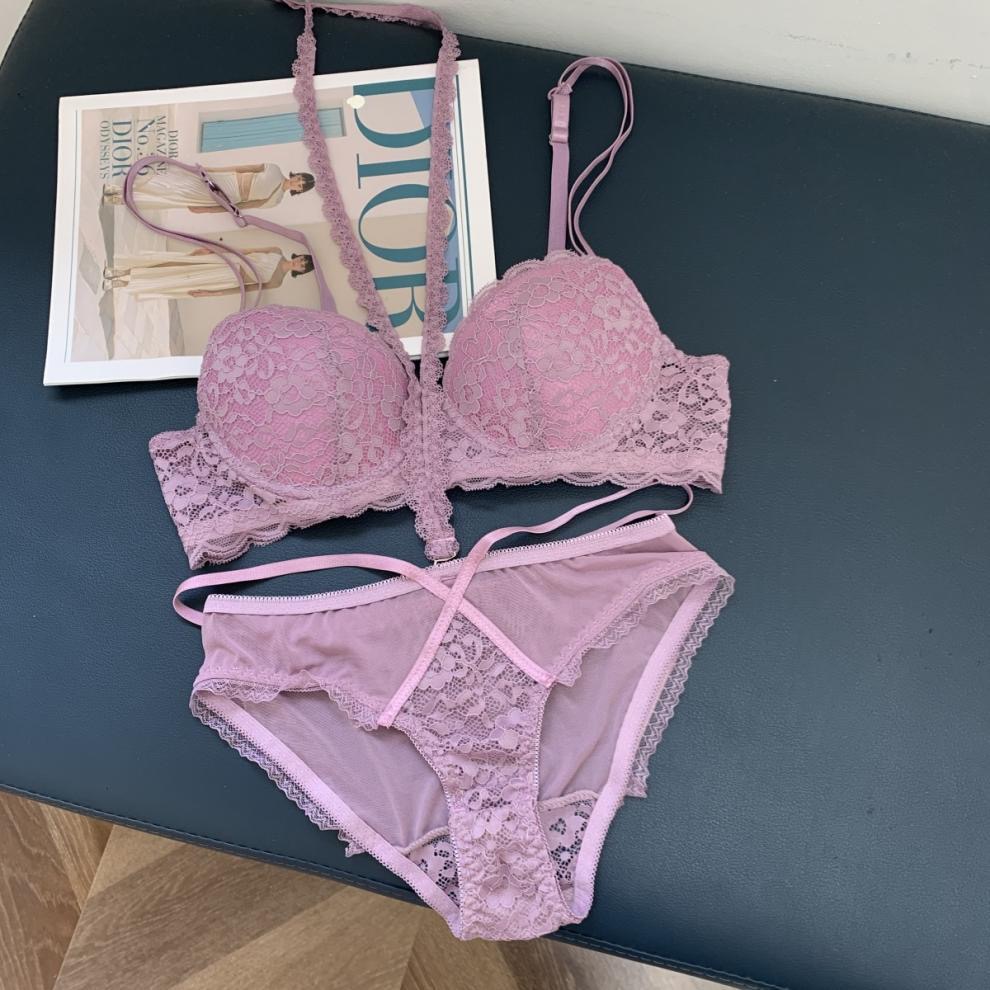 DEC桃色浪漫 性感蕾丝上托聚拢文胸套装纯欲辣妹挂脖内衣女