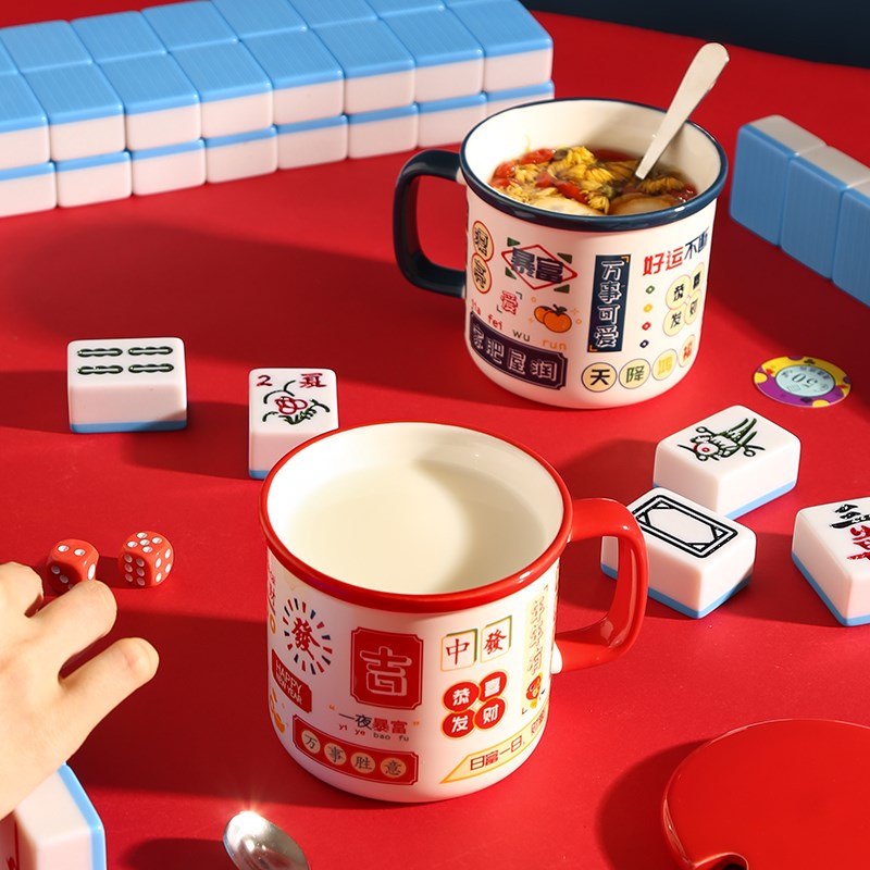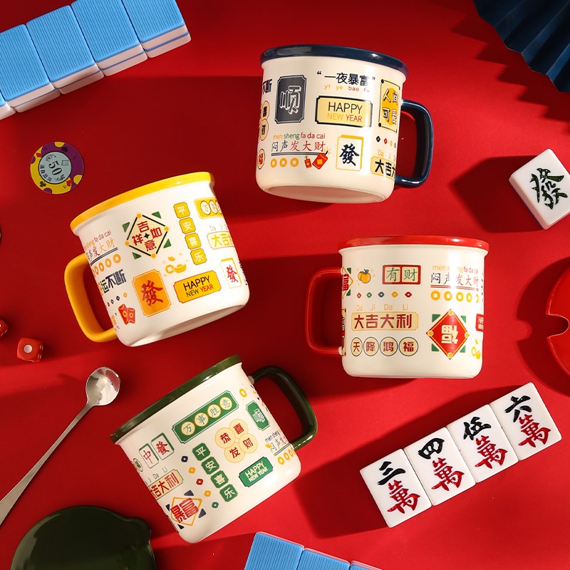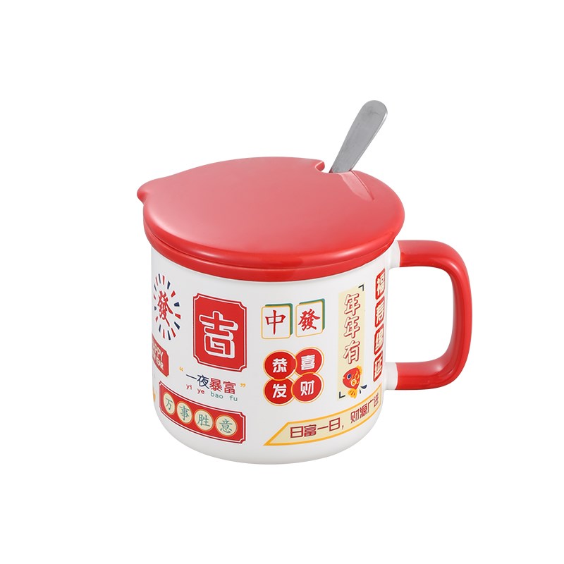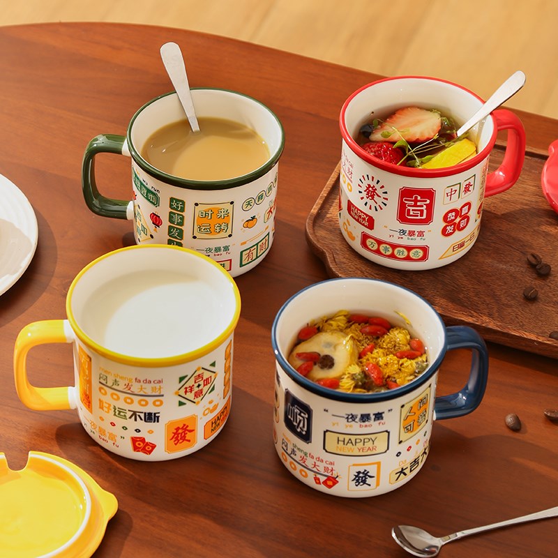 带盖马克杯国潮港风复古可爱情侣喜庆陶瓷女生发财水杯勺子年货