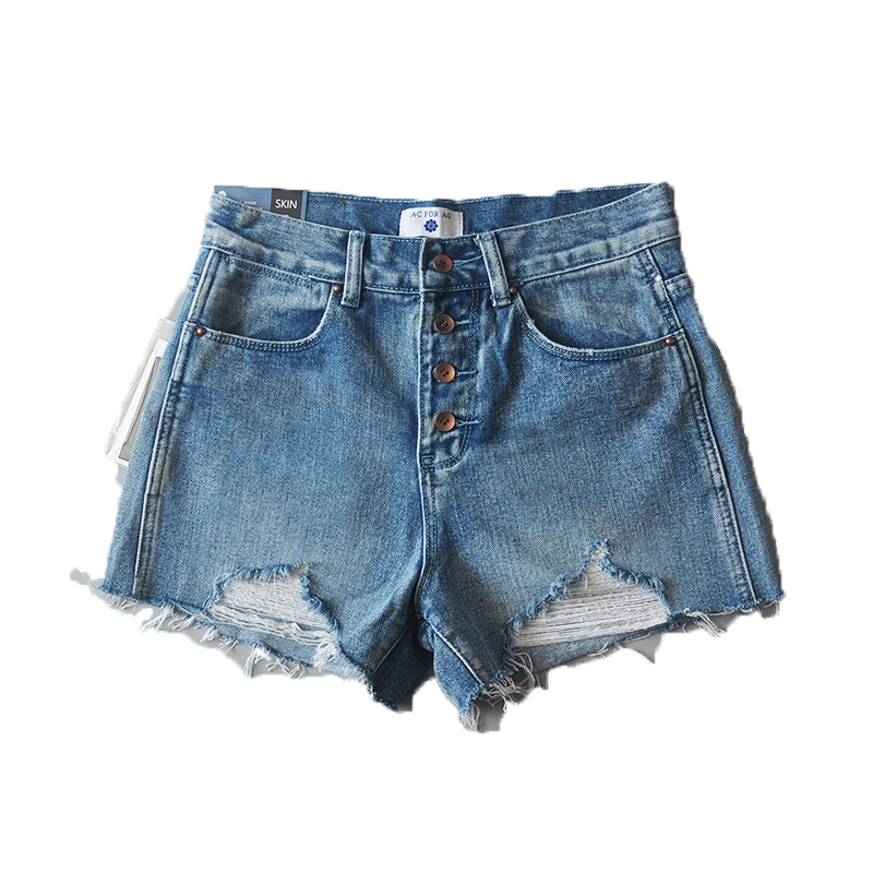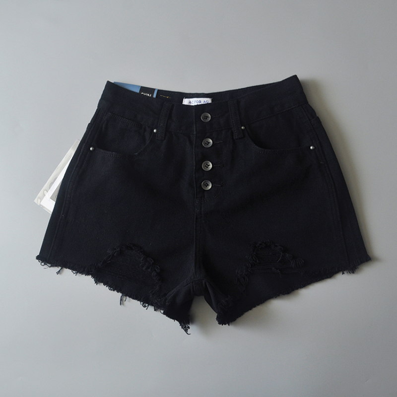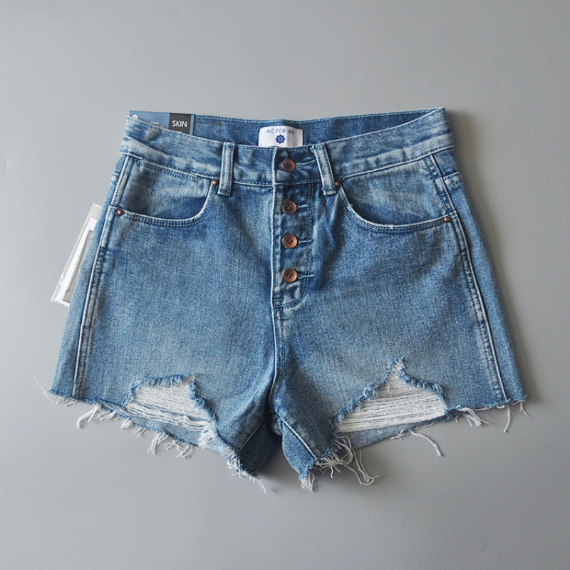 欧美风新款4粒排扣高腰牛仔短裤 破洞毛边休闲阔腿热裤a字裤 女