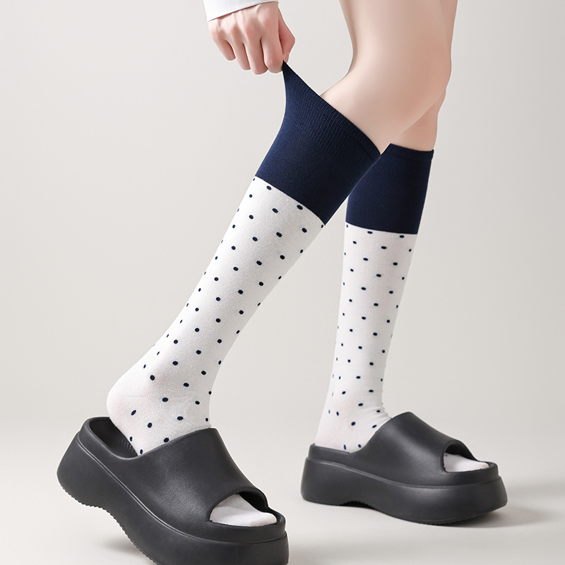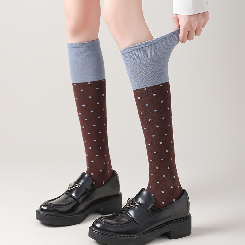 JW stylish 韩系波点小腿袜女撞色甜美百搭及膝堆堆袜中筒袜子