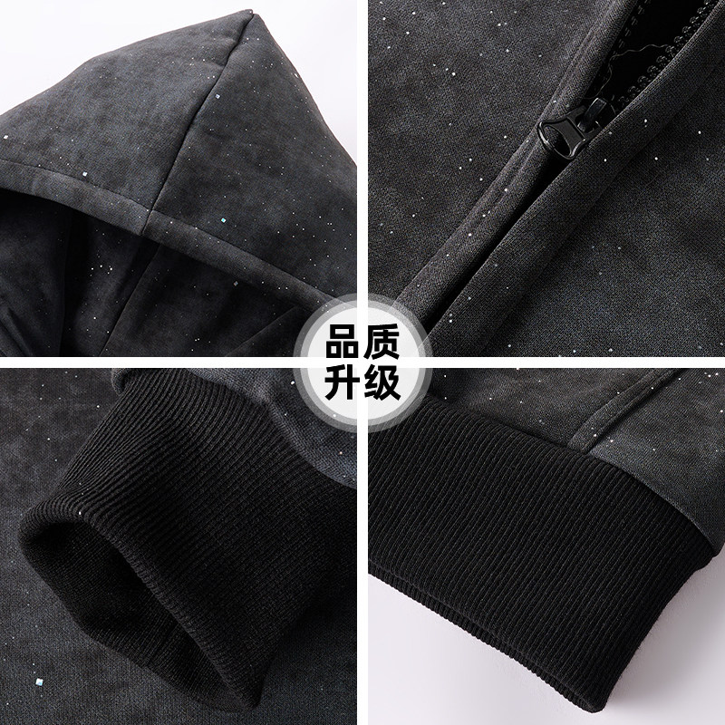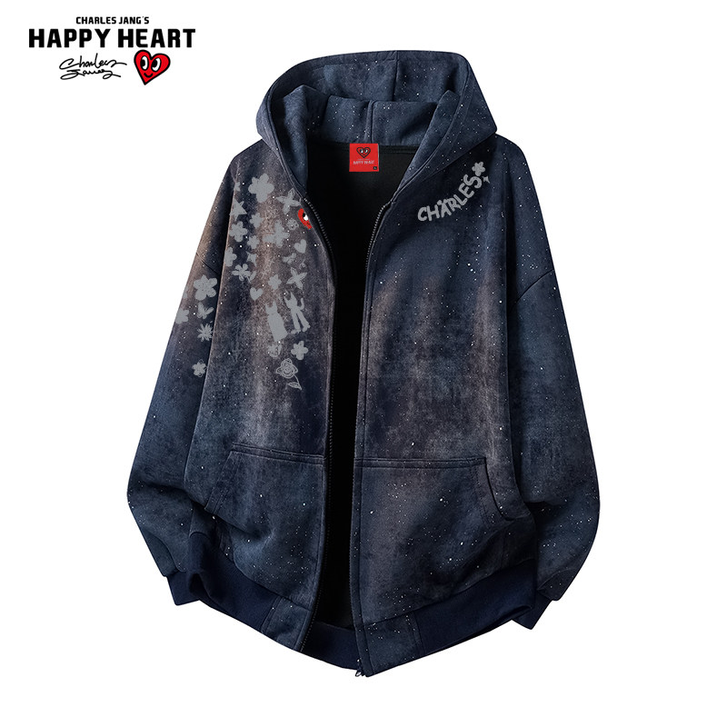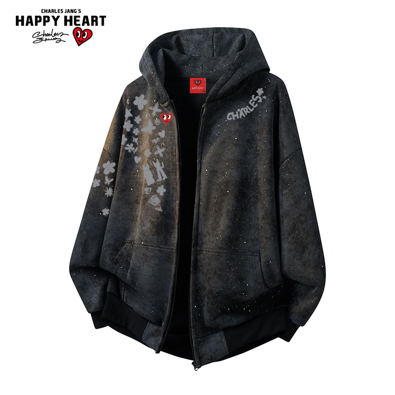 查尔斯桃心 涂鸦印花扎染开衫卫衣男春秋季美式连帽休闲百搭情侣