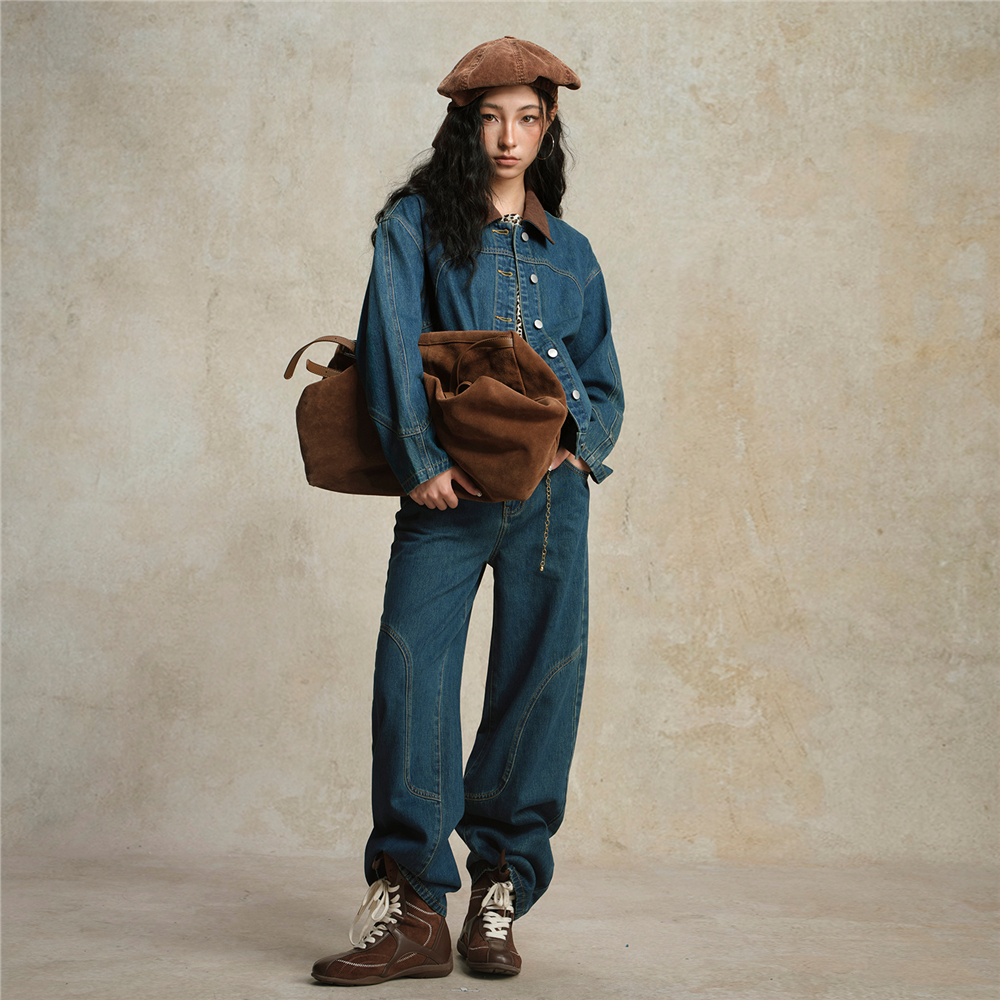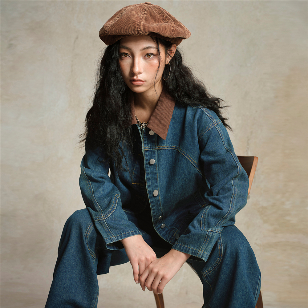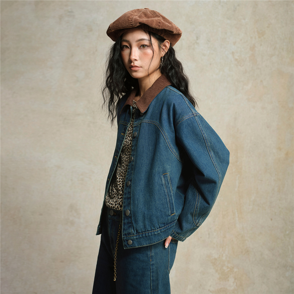 设计师款佐丹奴牛仔夹克女装拼接灯芯绒翻领宽松牛仔外套18375914