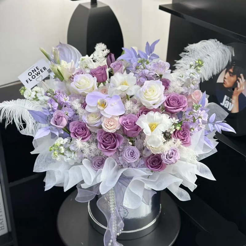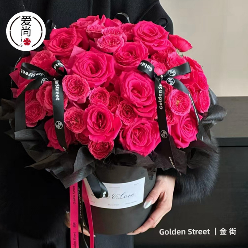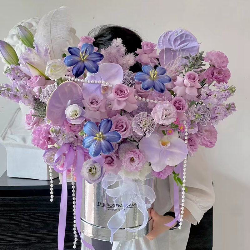 新款银色套二圆形抱抱桶鲜花包装盒金属质感花盒永生花艺插花纸盒