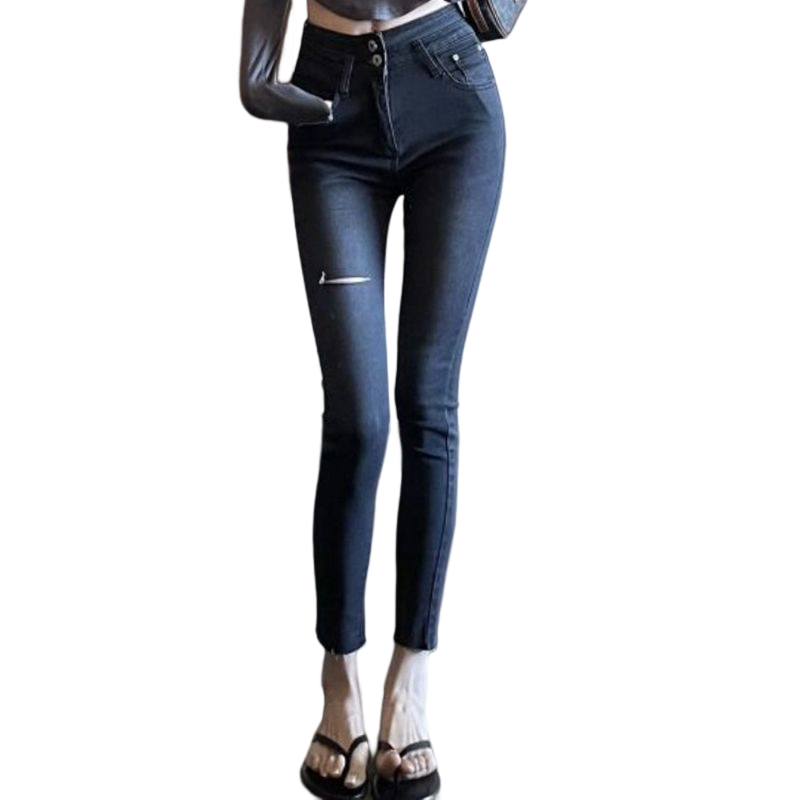 韩版破洞牛仔裤女2025新款两粒扣弹力紧身显瘦高腰九分铅笔小脚裤
