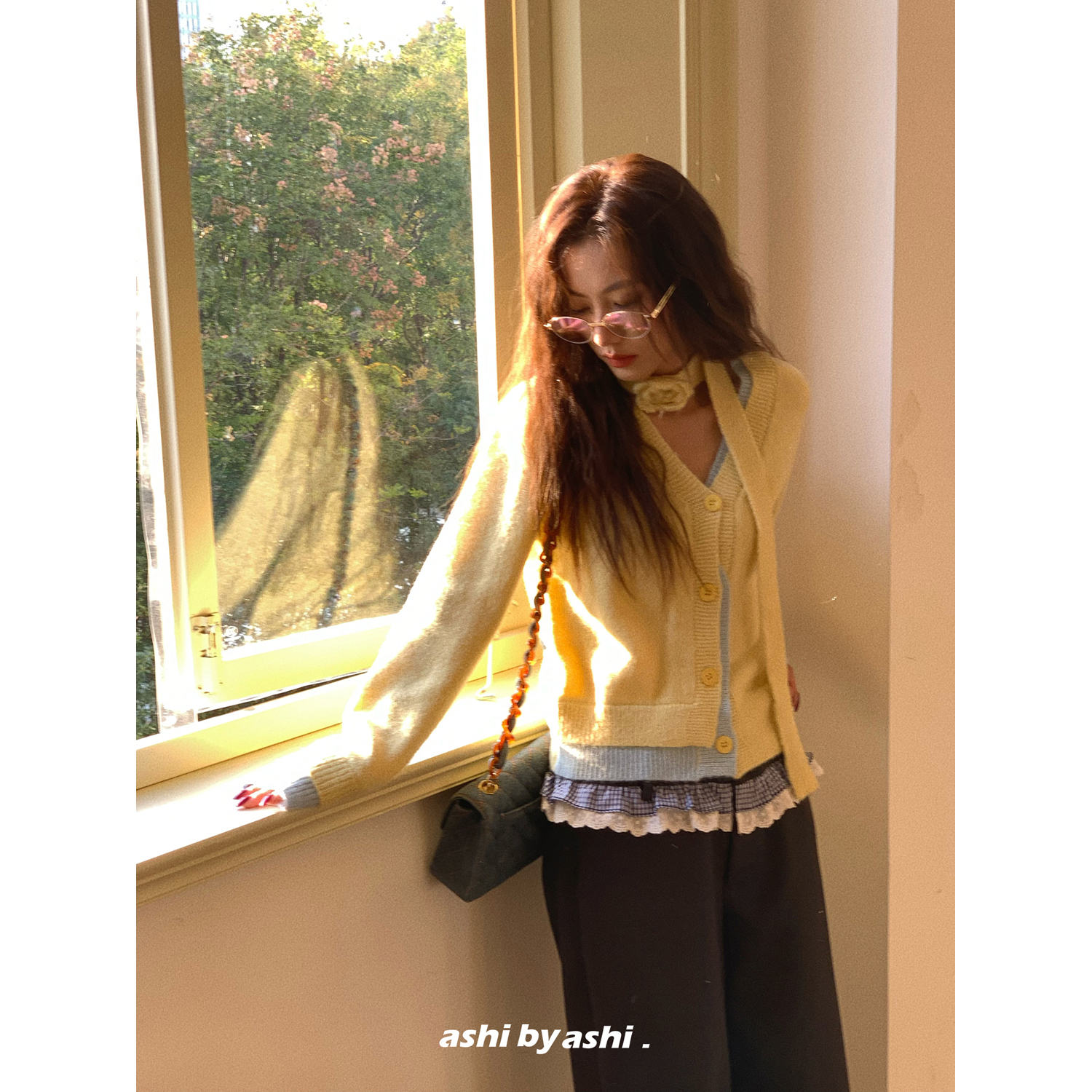 大于诗集 南港的秋 撞色假两件系带短款V领针织开衫女设计感毛衣