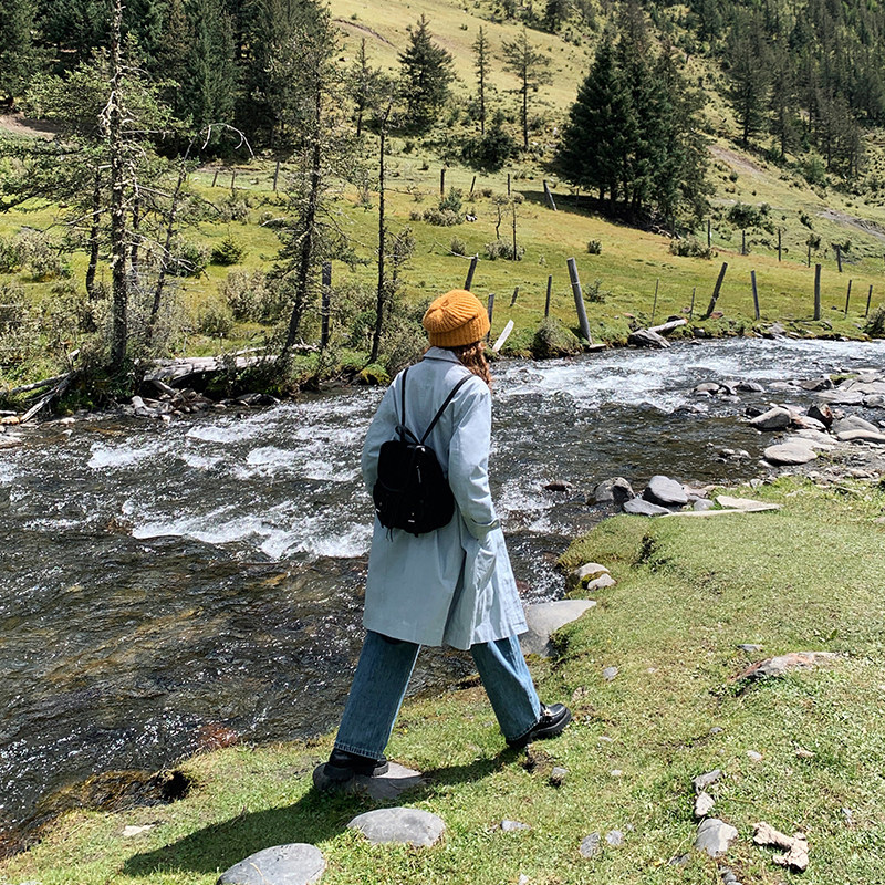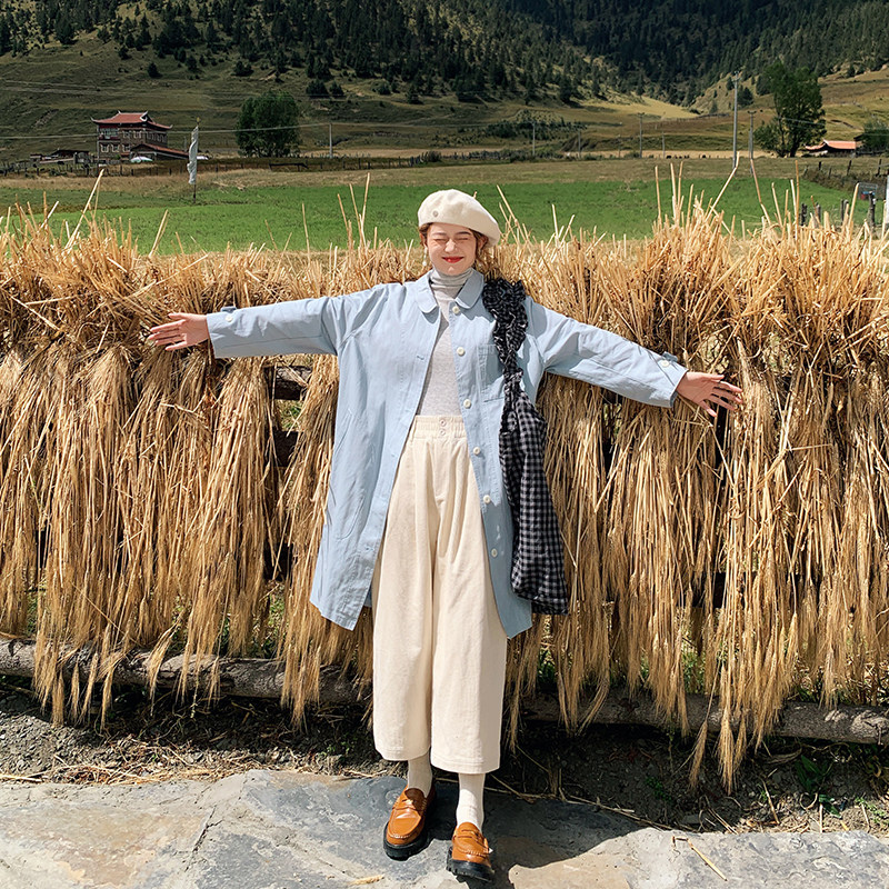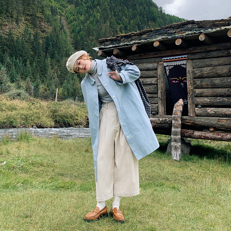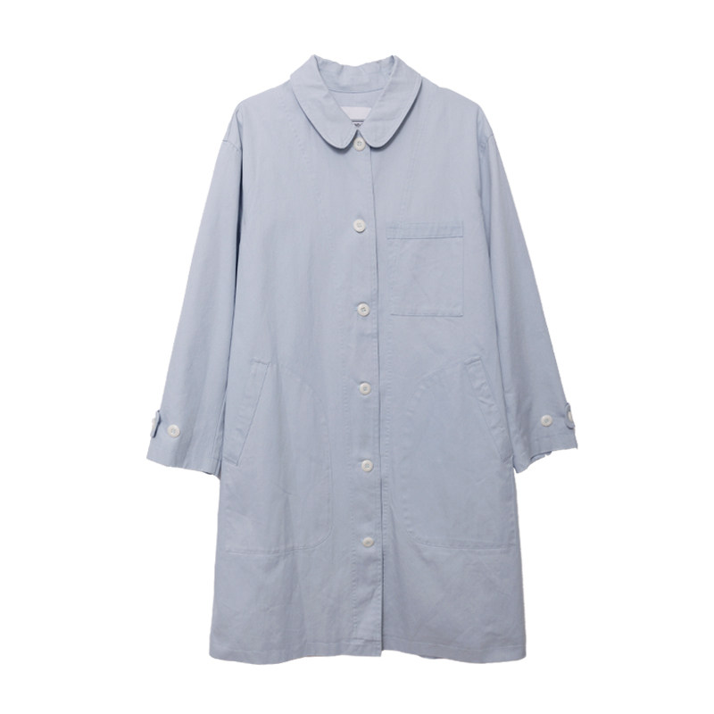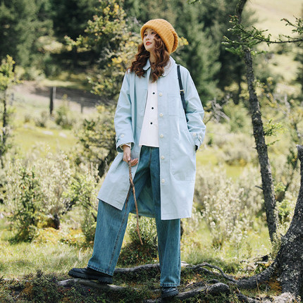 花吉B855奶油蓝色长袖小翻领纯棉中长款风衣女2025新款春季外套