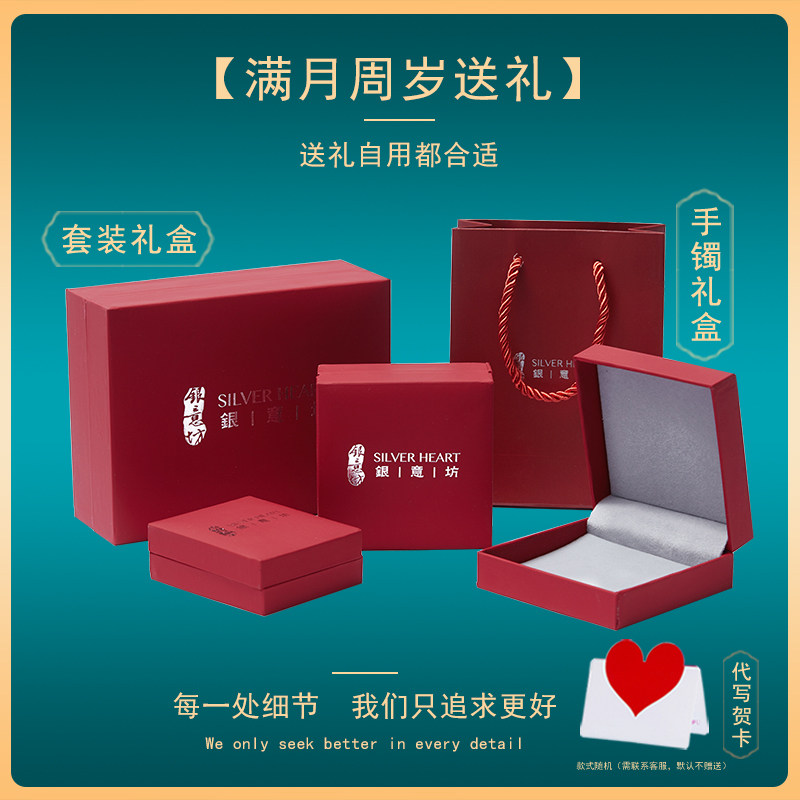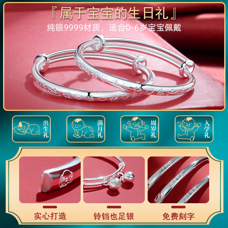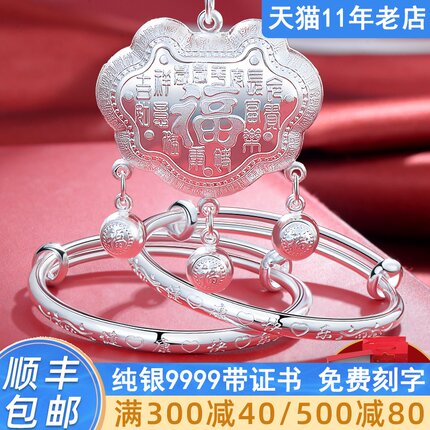 宝宝银手镯9999纯银长命锁银饰婴儿童银锁男女小孩银镯子满月礼物