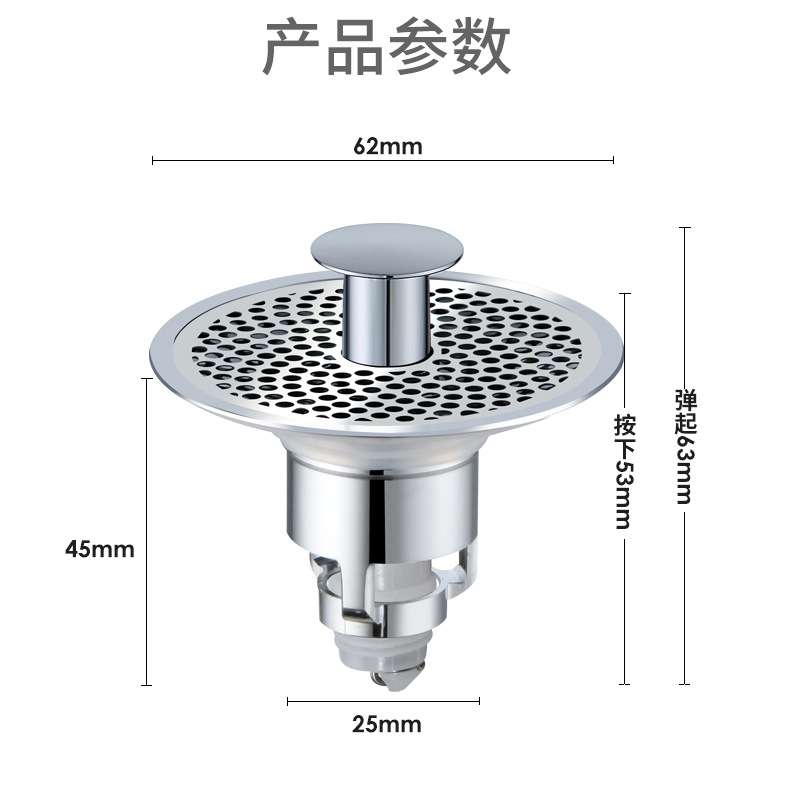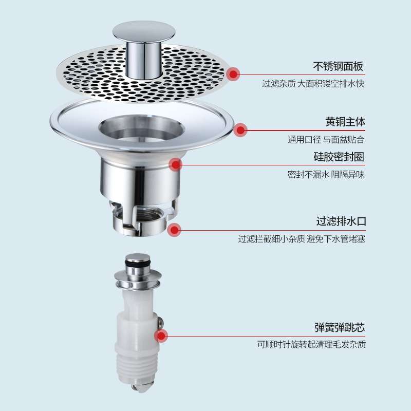 洗面盆黄铜按压式下水器304滤网防虫防堵塞漏水塞防臭下水弹跳芯