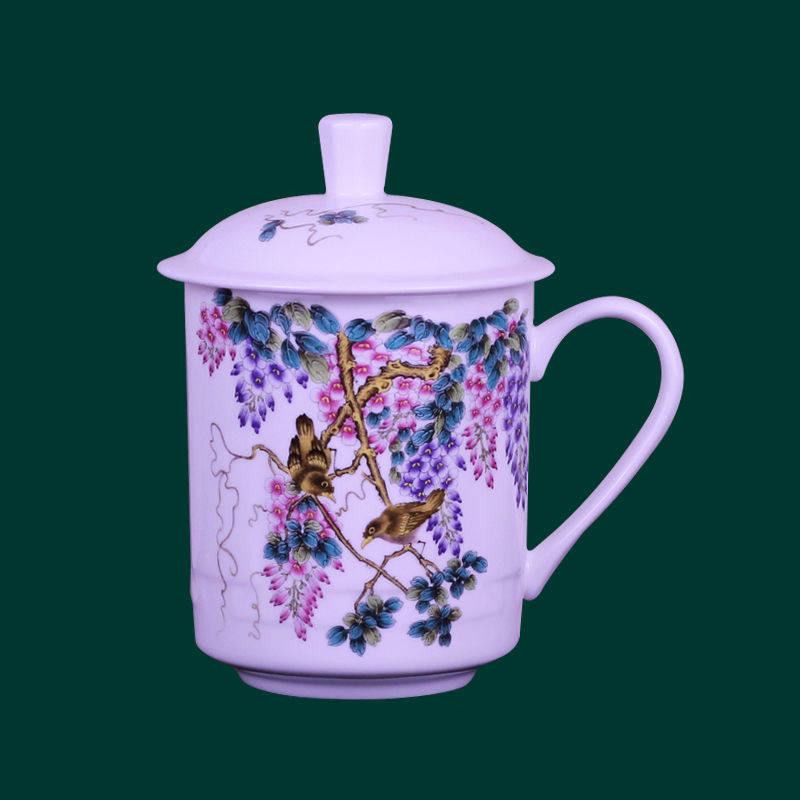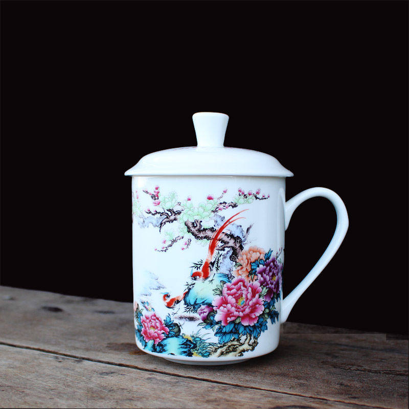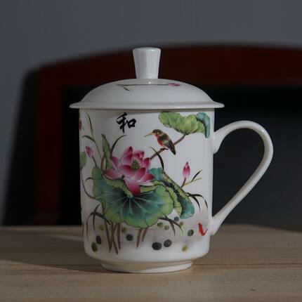 景德镇骨瓷茶杯粉彩陶瓷带盖水杯