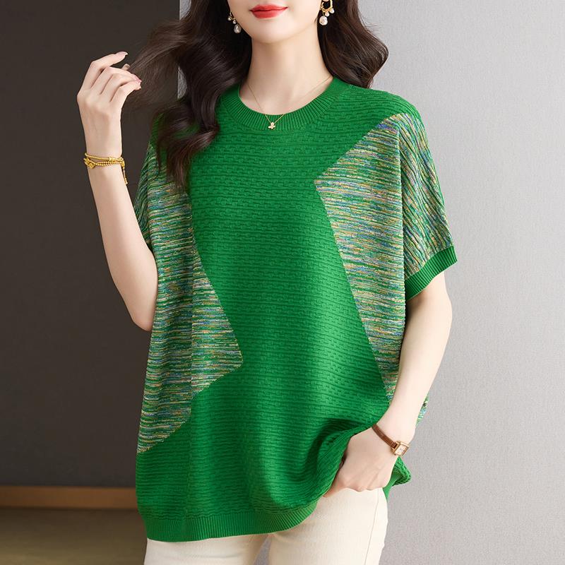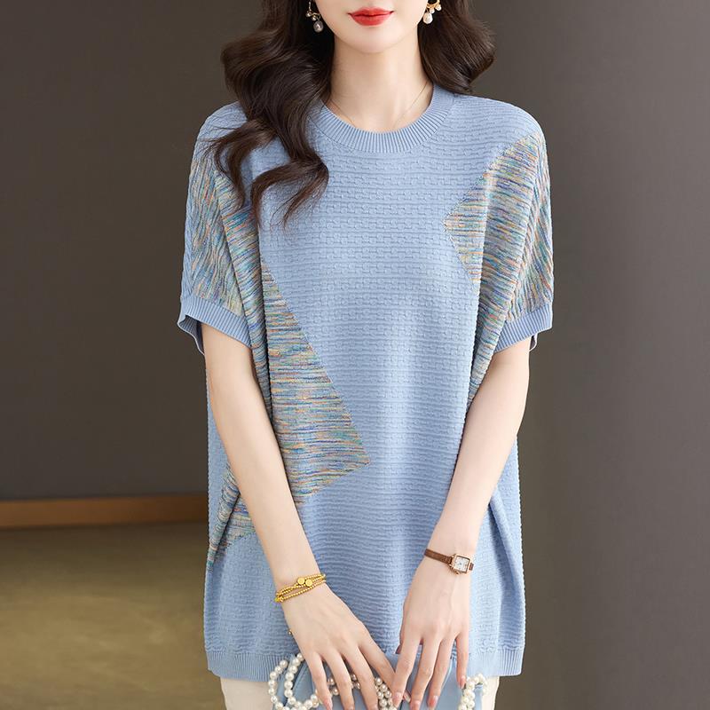 胖mm加大码桑蚕丝短袖t恤女中长款针织衫上衣宽松遮肚撞色打底衫