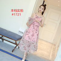 夏季名媛无袖吊带碎花雪纺连衣裙中长款挂脖露肩波西米亚渡假长裙
