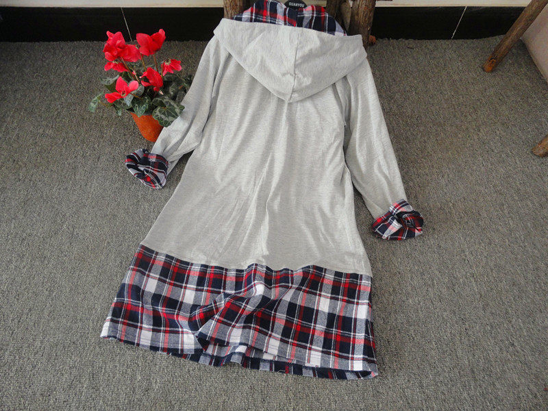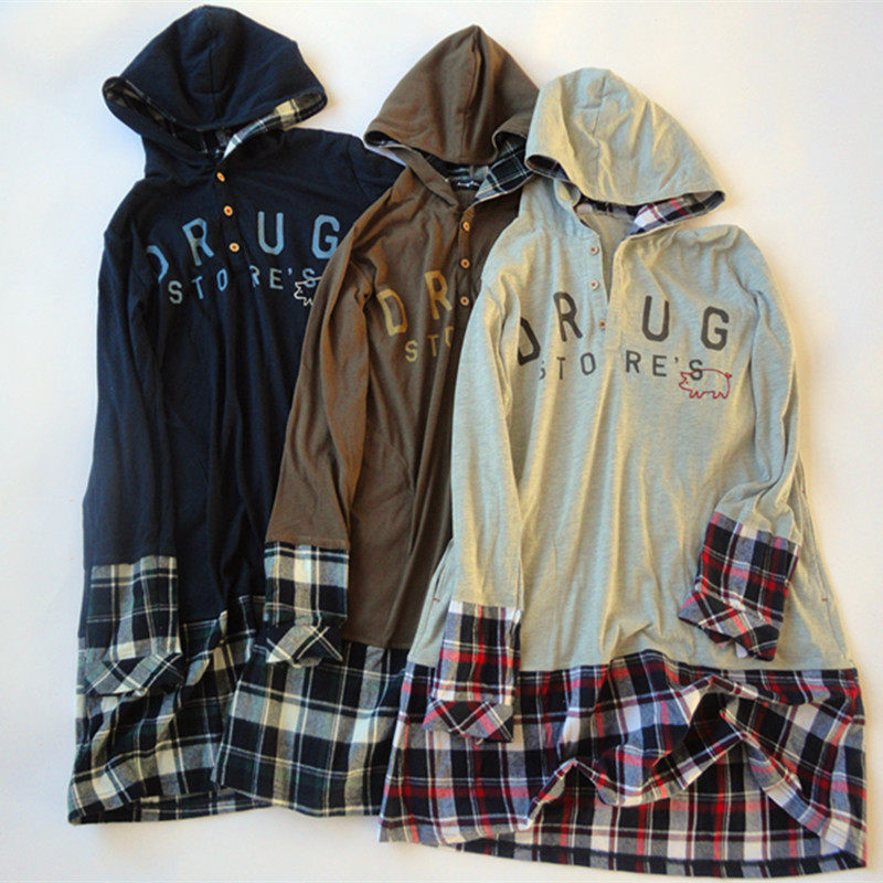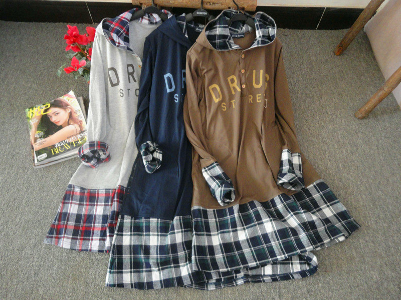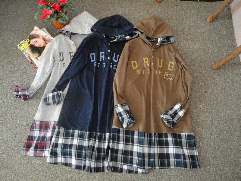 原单新款文艺小猪rug store日单女装纯棉加长连帽T拼接格子连衣裙