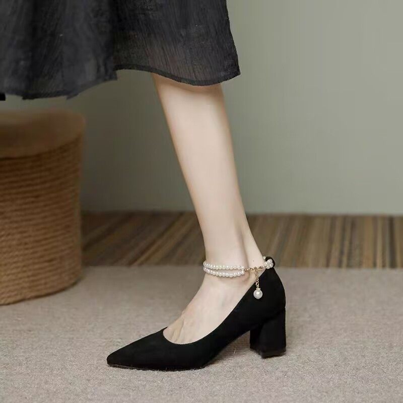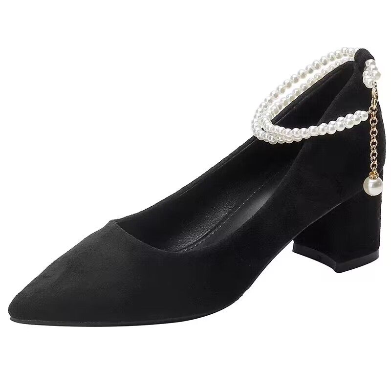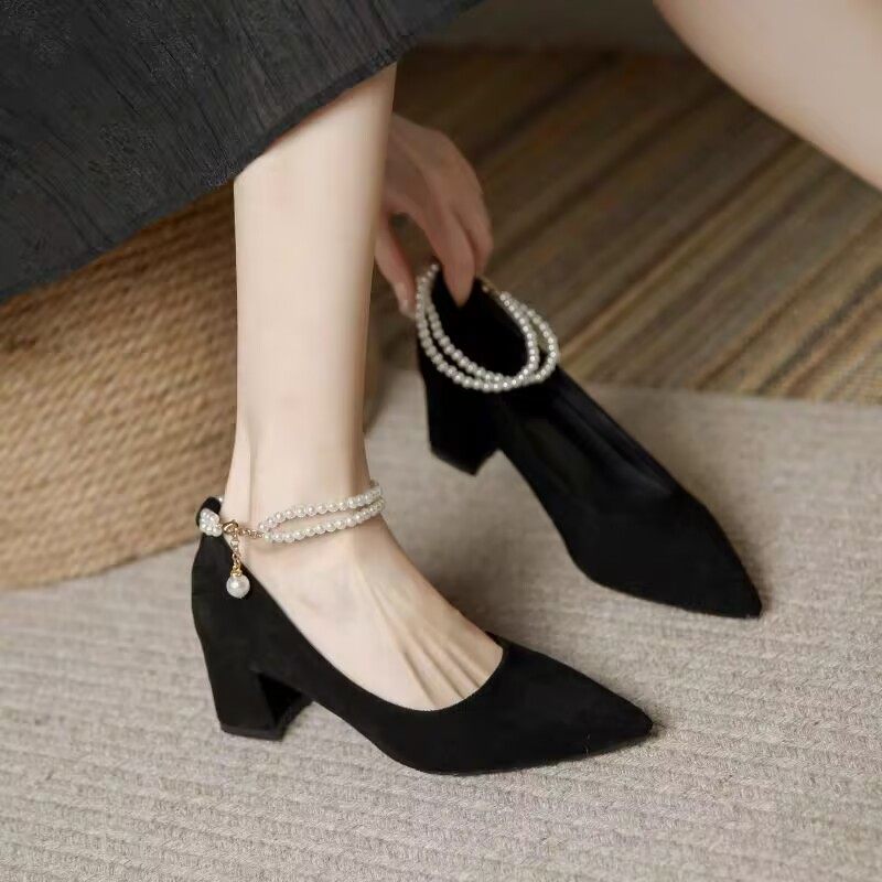 春秋季新款法式百搭珍珠单鞋女中粗跟小众配裙子尖头高跟鞋黑色鞋