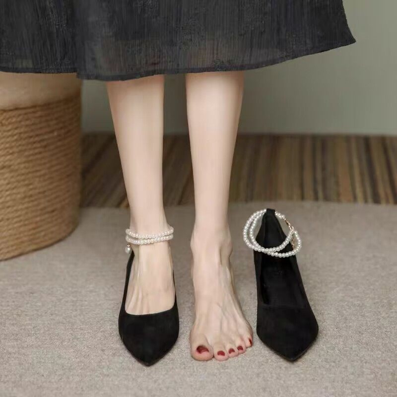 黑色高跟鞋配裙子一字带小众珍珠