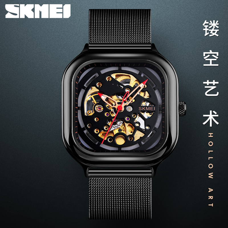 新方形简约机械表男全自动镂空透明防水飞轮齿轮夜光轻奢男机械表