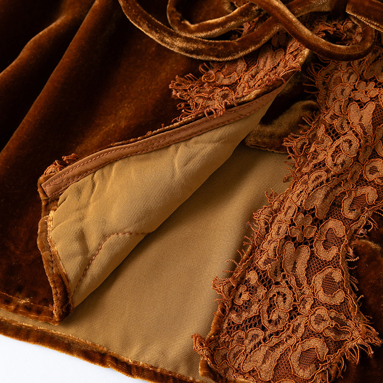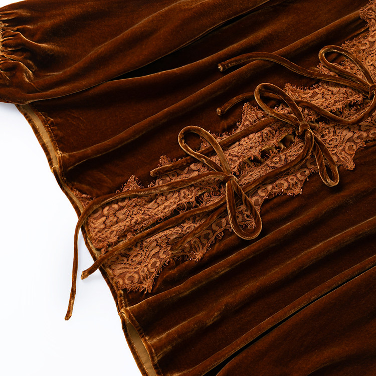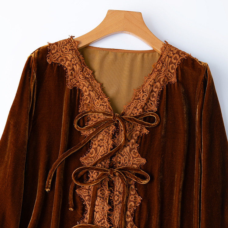 富贵焦糖金!轻奢真丝丝绒精致蕾丝边V领系带长袖衬衫外搭女款新