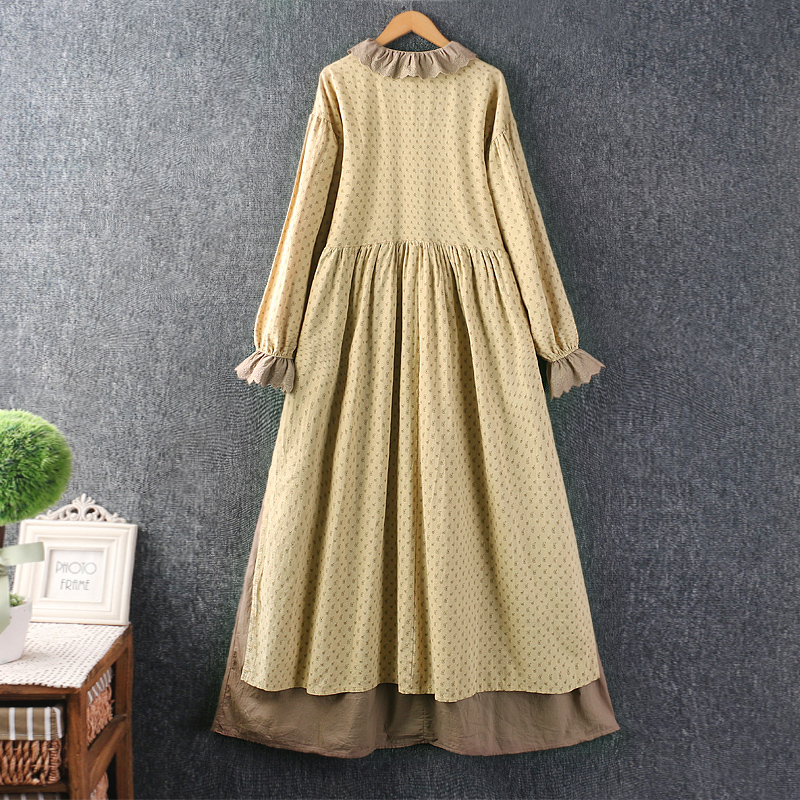 秋装新款女装日系小清新刺绣翻领棉麻碎花长裙双层下摆叠穿连衣裙