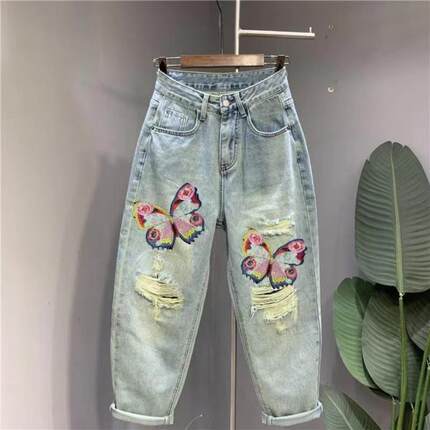 欧货重工刺绣蝴蝶牛仔哈伦裤女秋夏新款破洞九分老爹裤大码垮裤潮