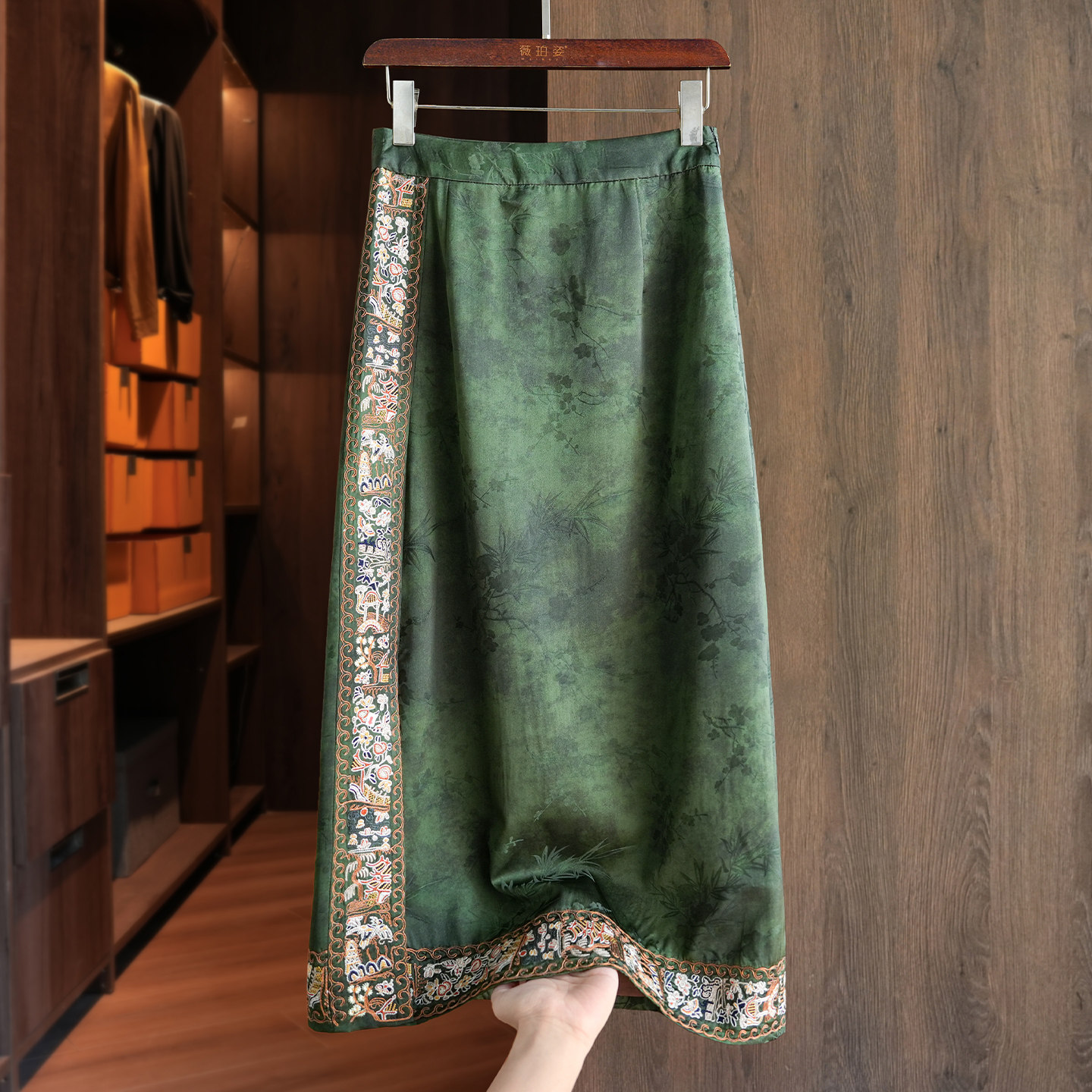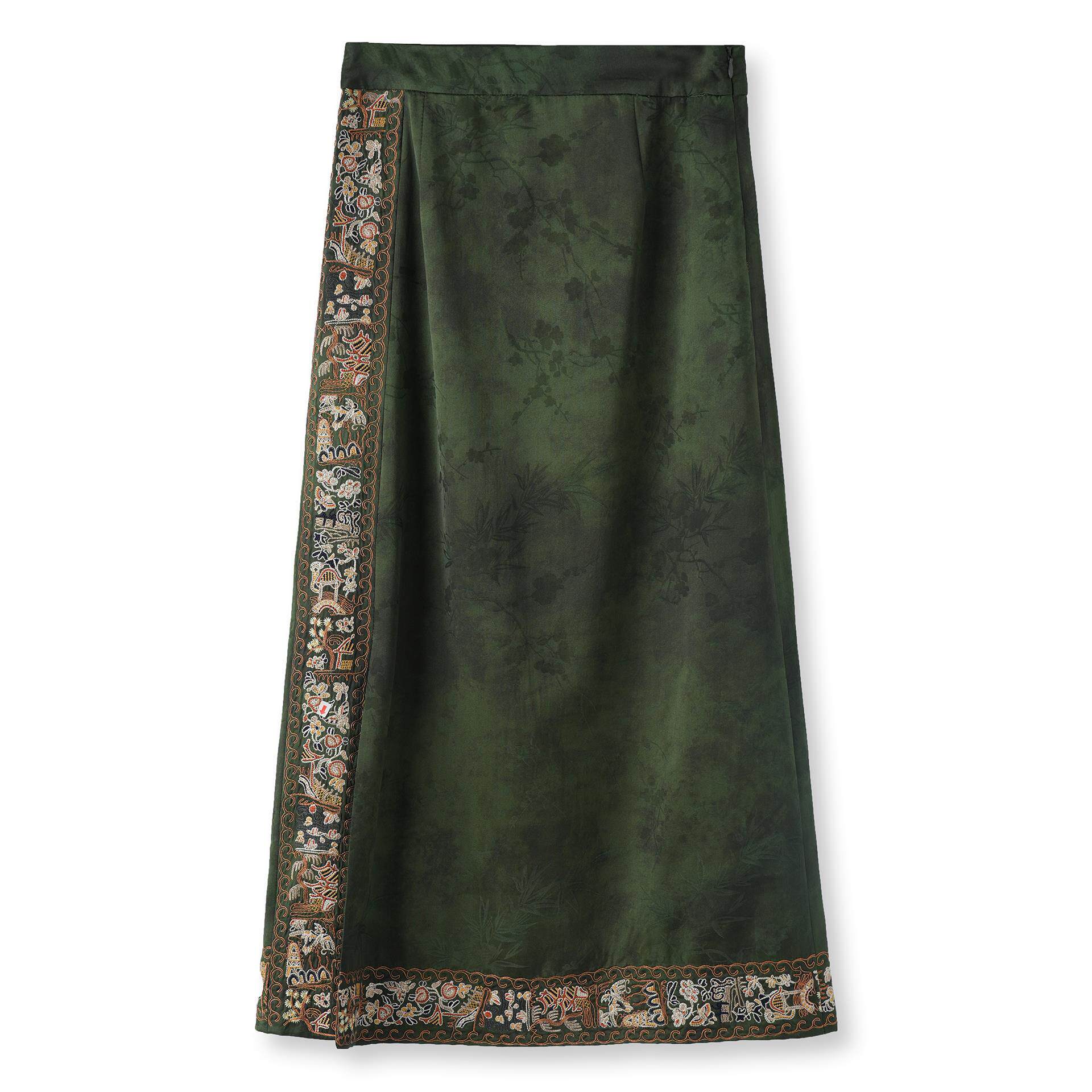 绿色人丝提花新中式半身裙女新款复古刺绣斜裁显瘦高腰直筒中长裙