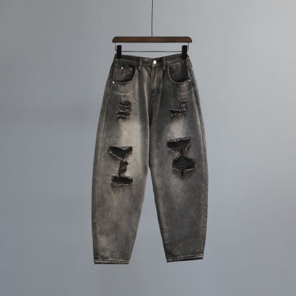 黑灰色高腰老爹牛仔裤女潮2025秋季新款宽松休闲假破洞哈伦裤垮裤
