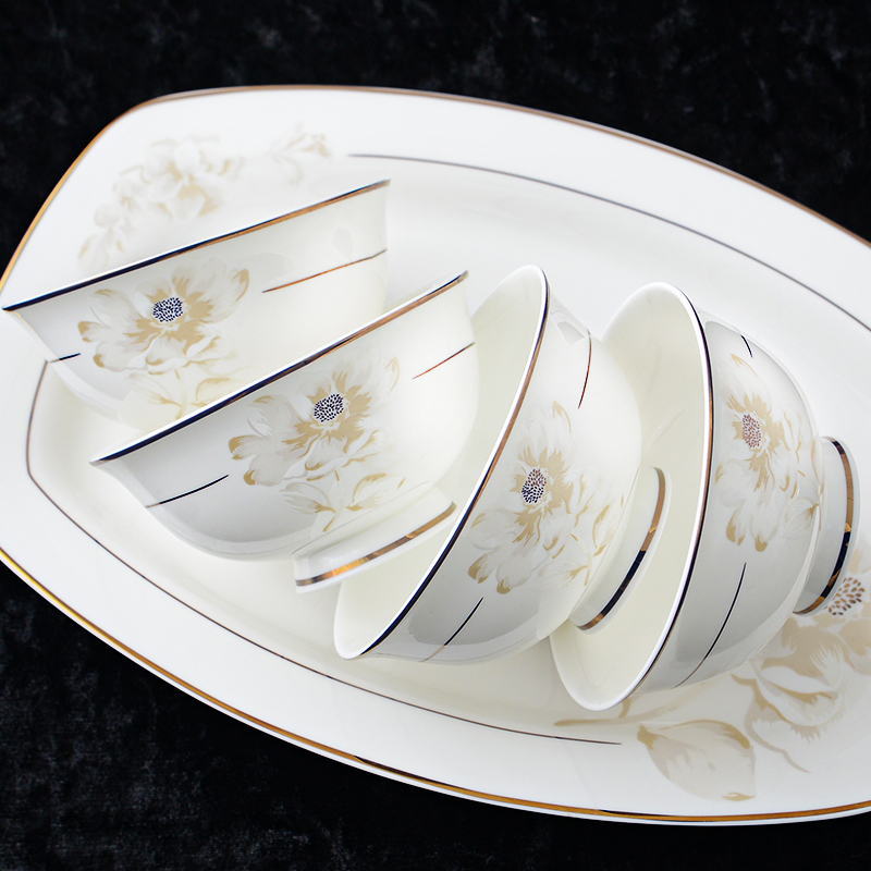 唐山骨瓷饭碗家用陶瓷碗碟套装吃饭碗盘餐具组合米饭高脚碗10个装