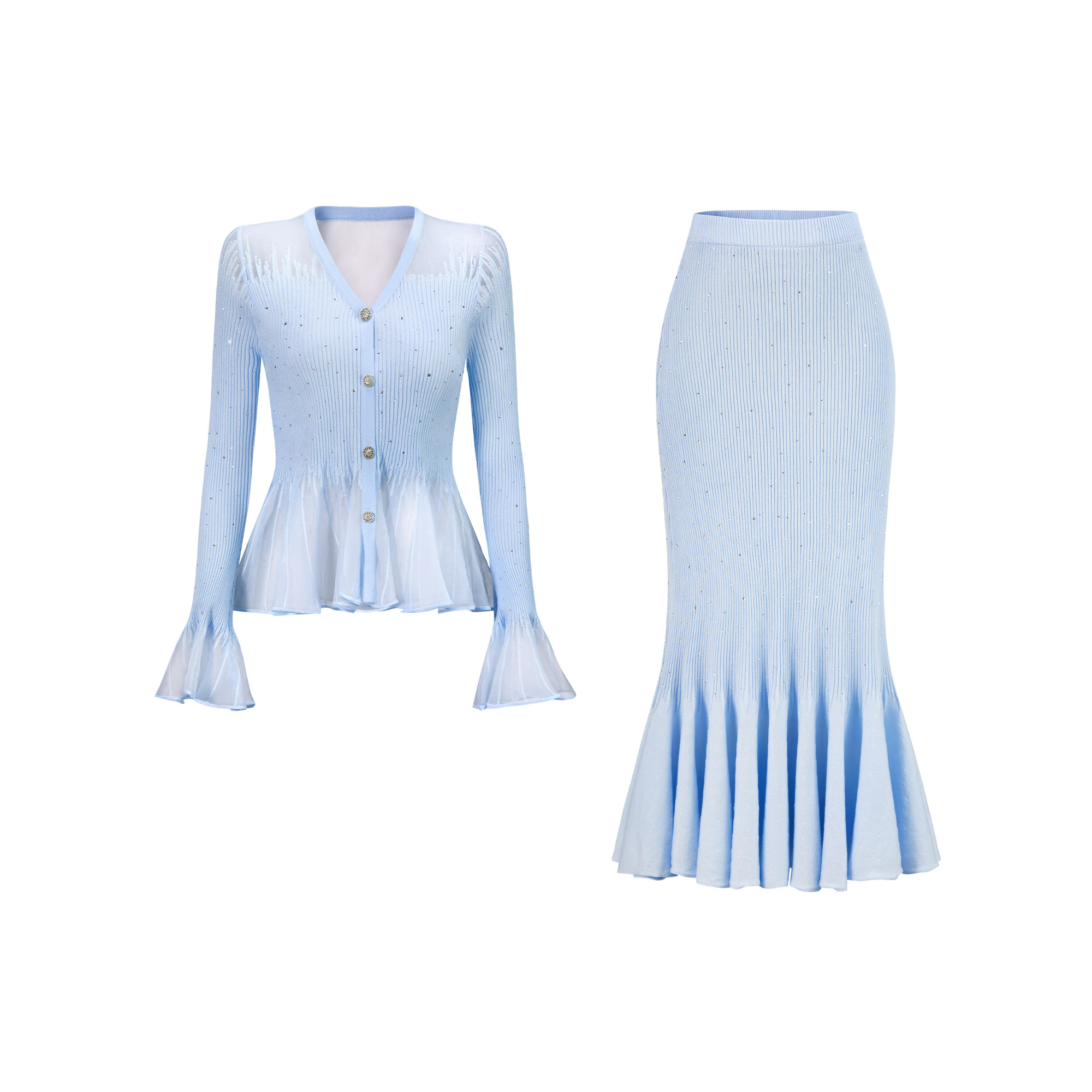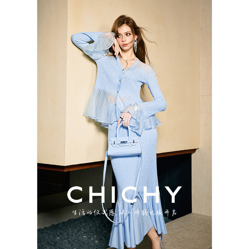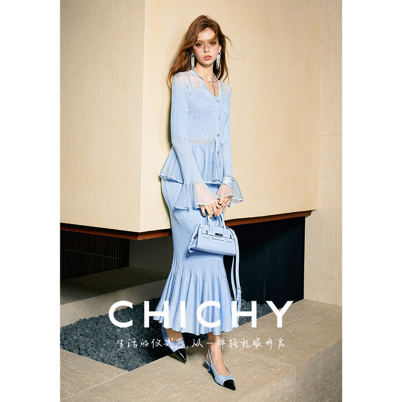 CHICHY高级千金V领薄款烫钻针织套装女春季款蓝色修身鱼尾长半裙