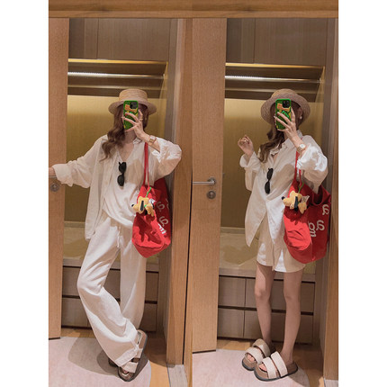 Yukiss 老钱风氧气亚麻衬衫阔腿休闲裤两件套女夏季韩系宽松套装