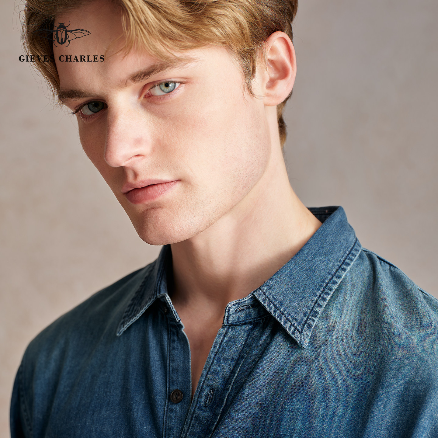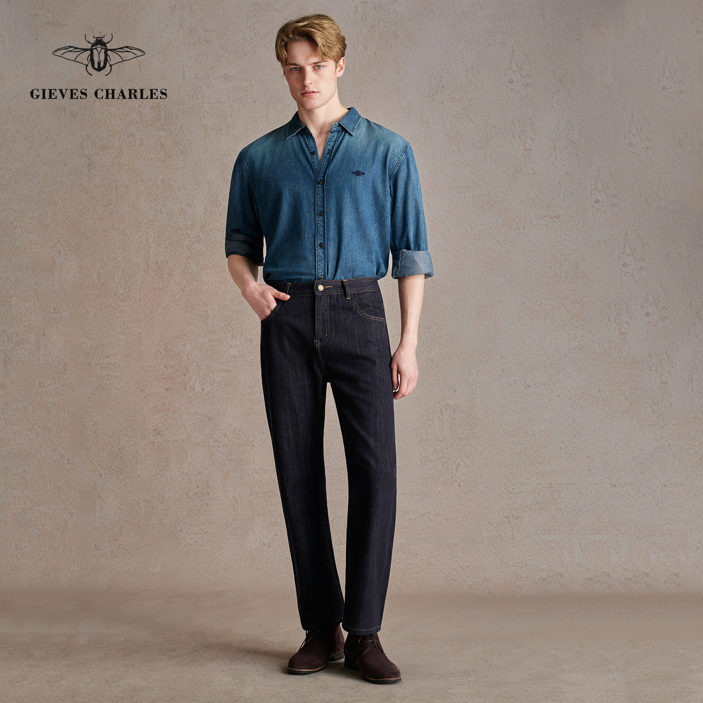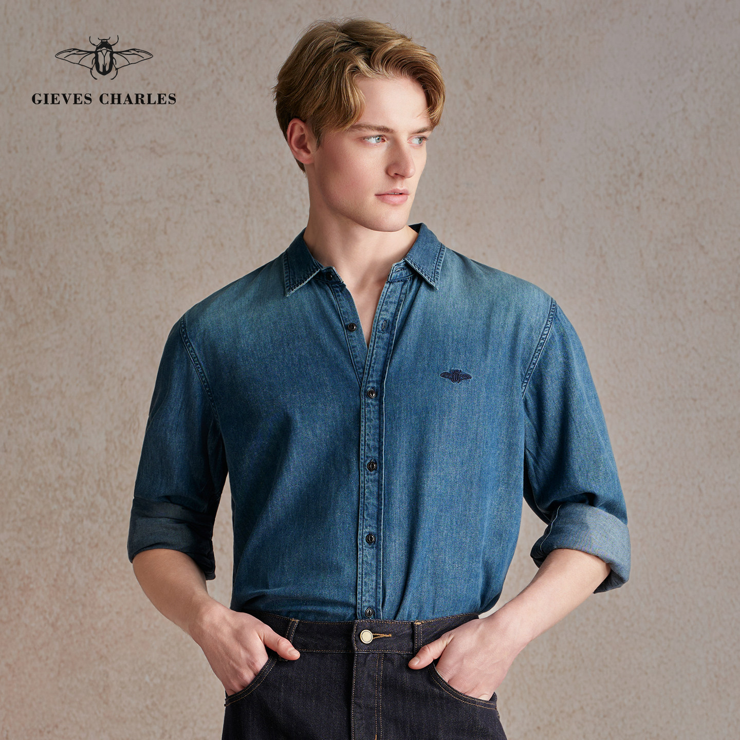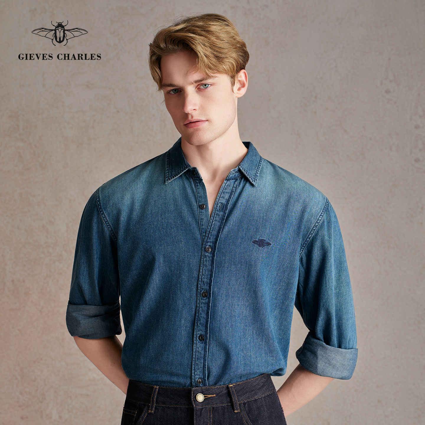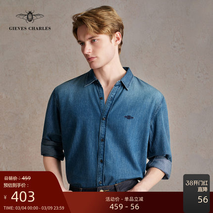【早春新品】美式复古休闲刺绣牛仔衬衫男士蓝色牛仔衬衫外套