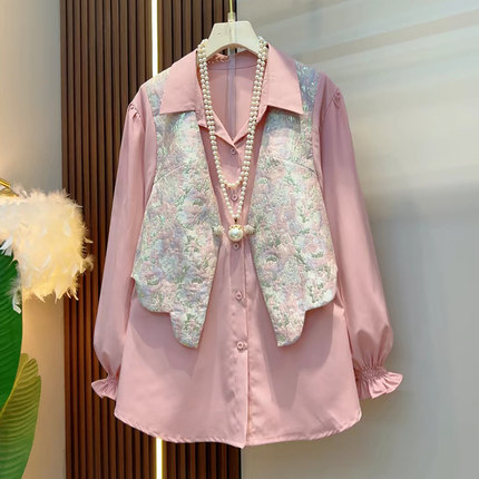 大码女装刺绣长袖国风假两件衬衫