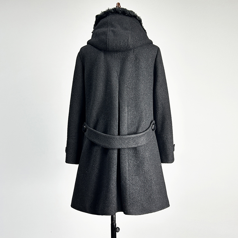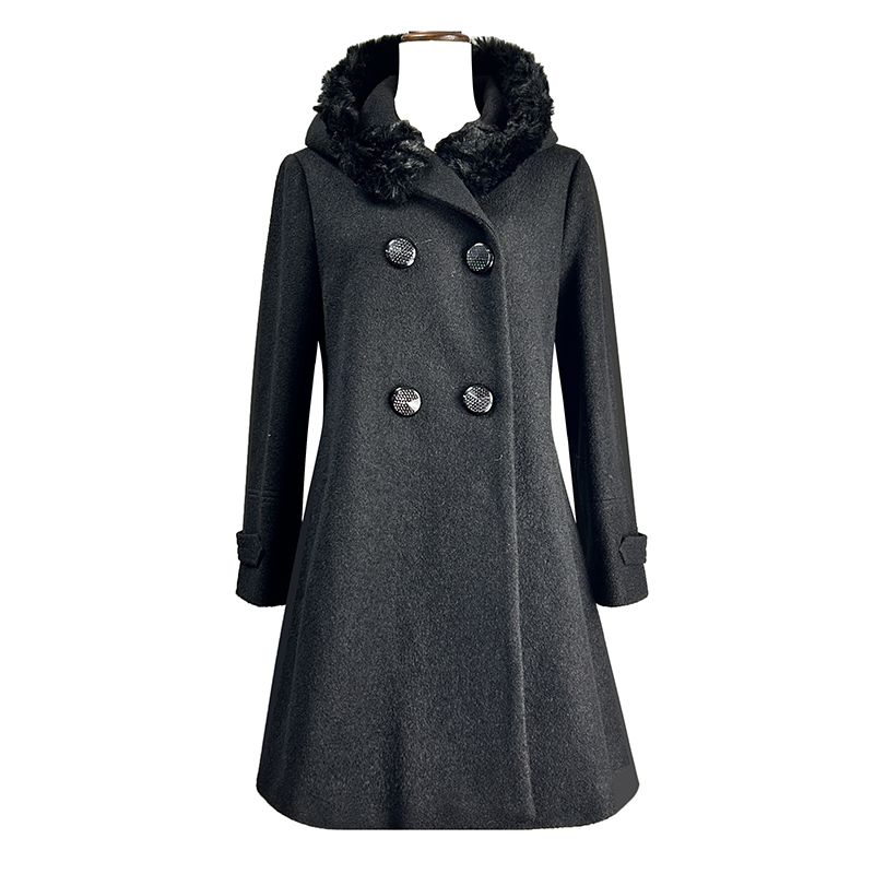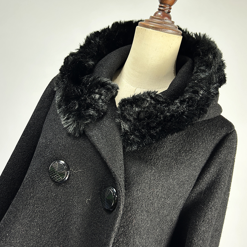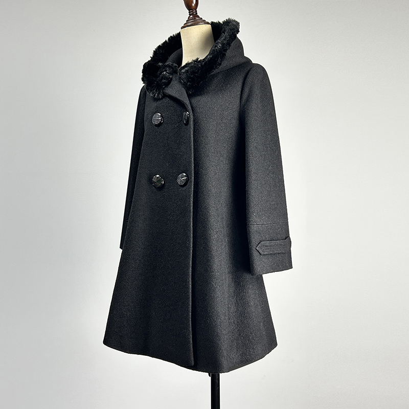 品牌中长款黑色连帽羊毛呢大衣女2025秋冬简约双排扣九分袖外套
