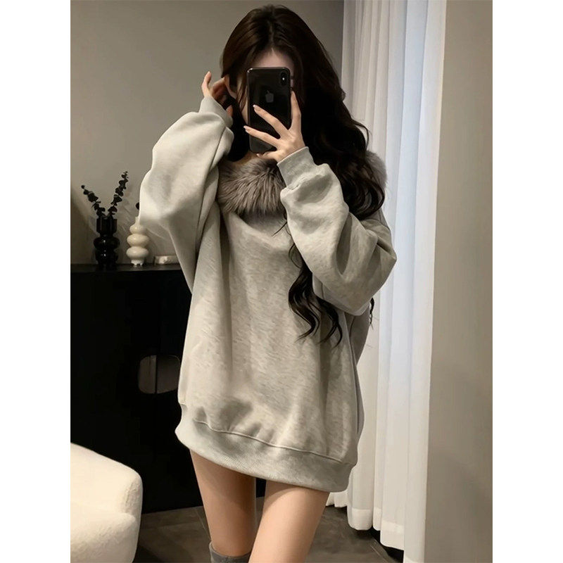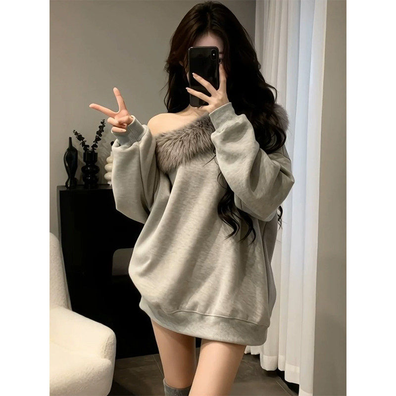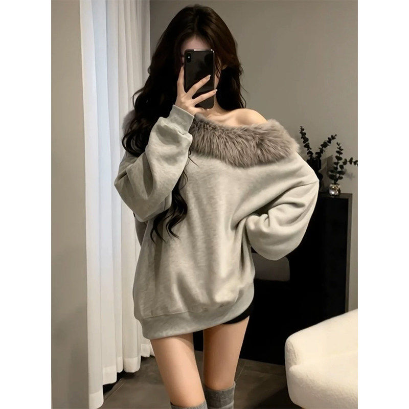 美式复古灰色毛领斜肩卫衣女秋冬宽松慵懒风加绒加厚套头长袖上衣