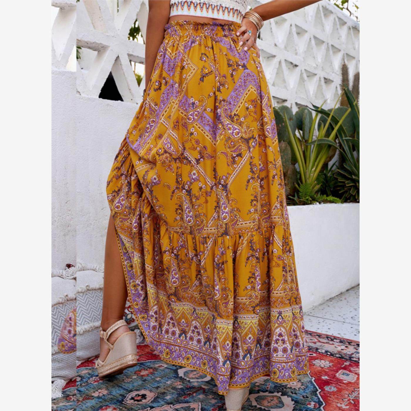 欧美波西米亚度假云南民族风印花夏季大码女装沙滩长裙高腰半身裙