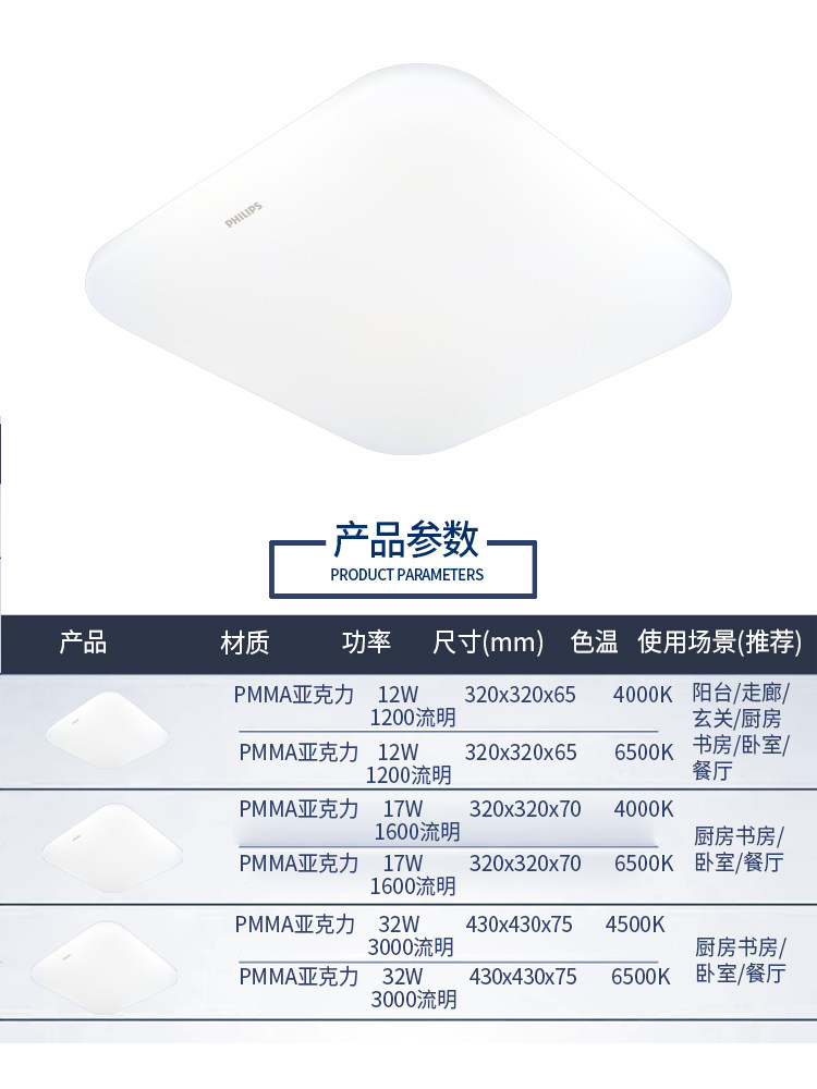 飞利浦led吸顶灯书房房间卧室灯厨房卫生间阳台顶灯现代简约方形
