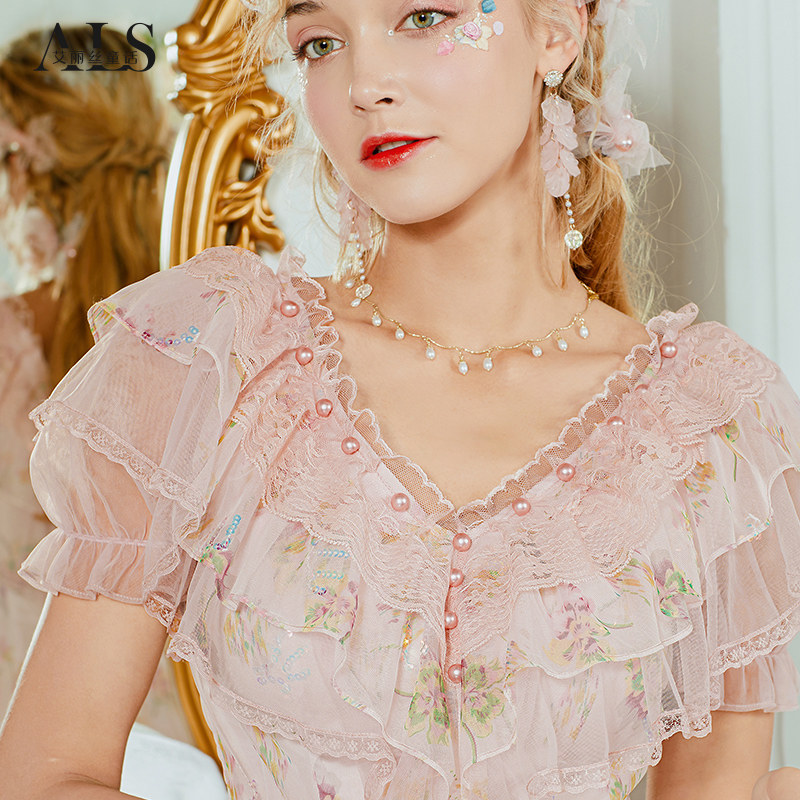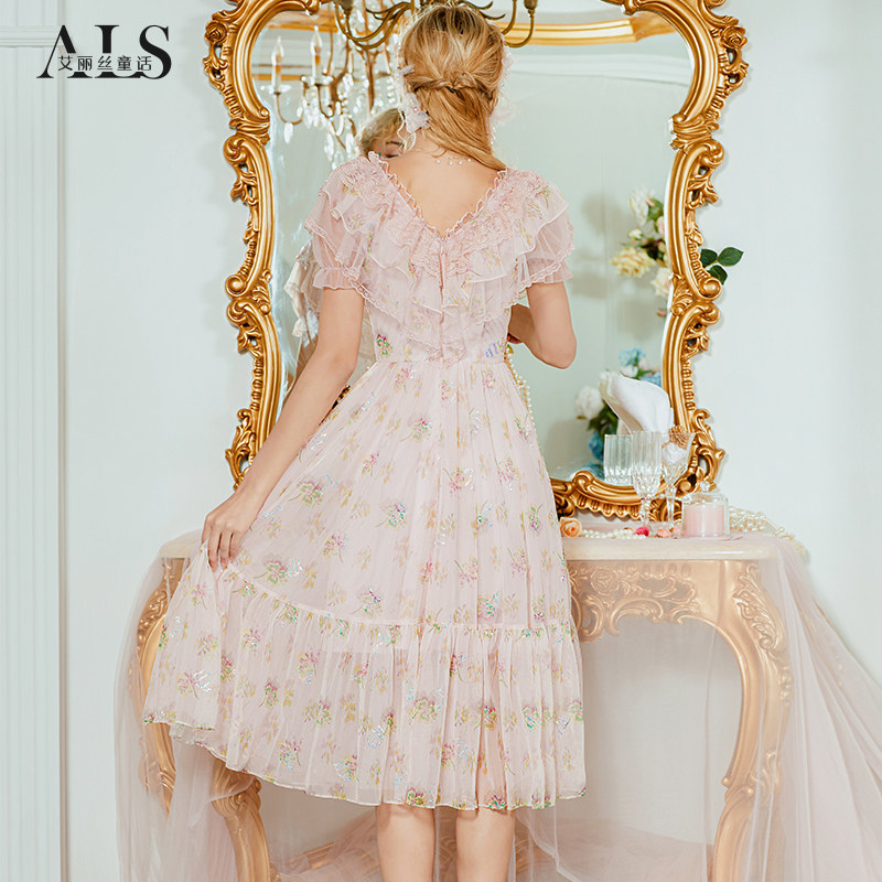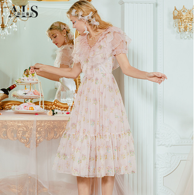 艾丽丝超仙公主风淑女裙2025年夏季新款荷叶边v领甜美印花连衣裙