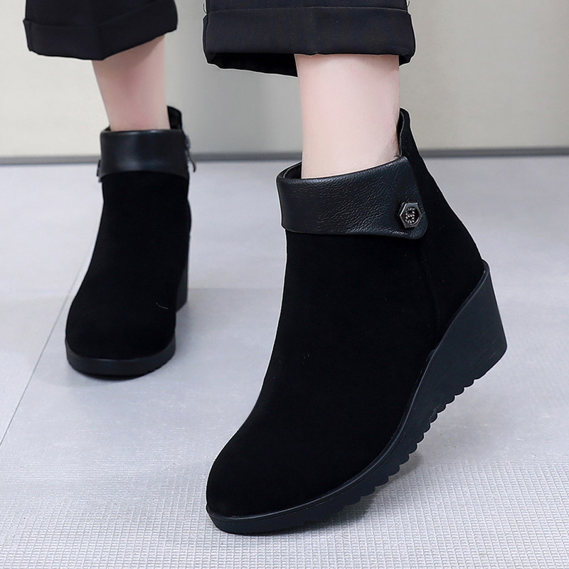真皮软底妈妈鞋2025秋冬百搭坡跟短靴大码女靴磨砂皮黑色加绒棉鞋