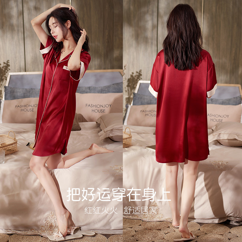 冰丝睡裙女士夏季薄款短袖睡衣仿真丝绸新娘结婚红色晨袍女家居服