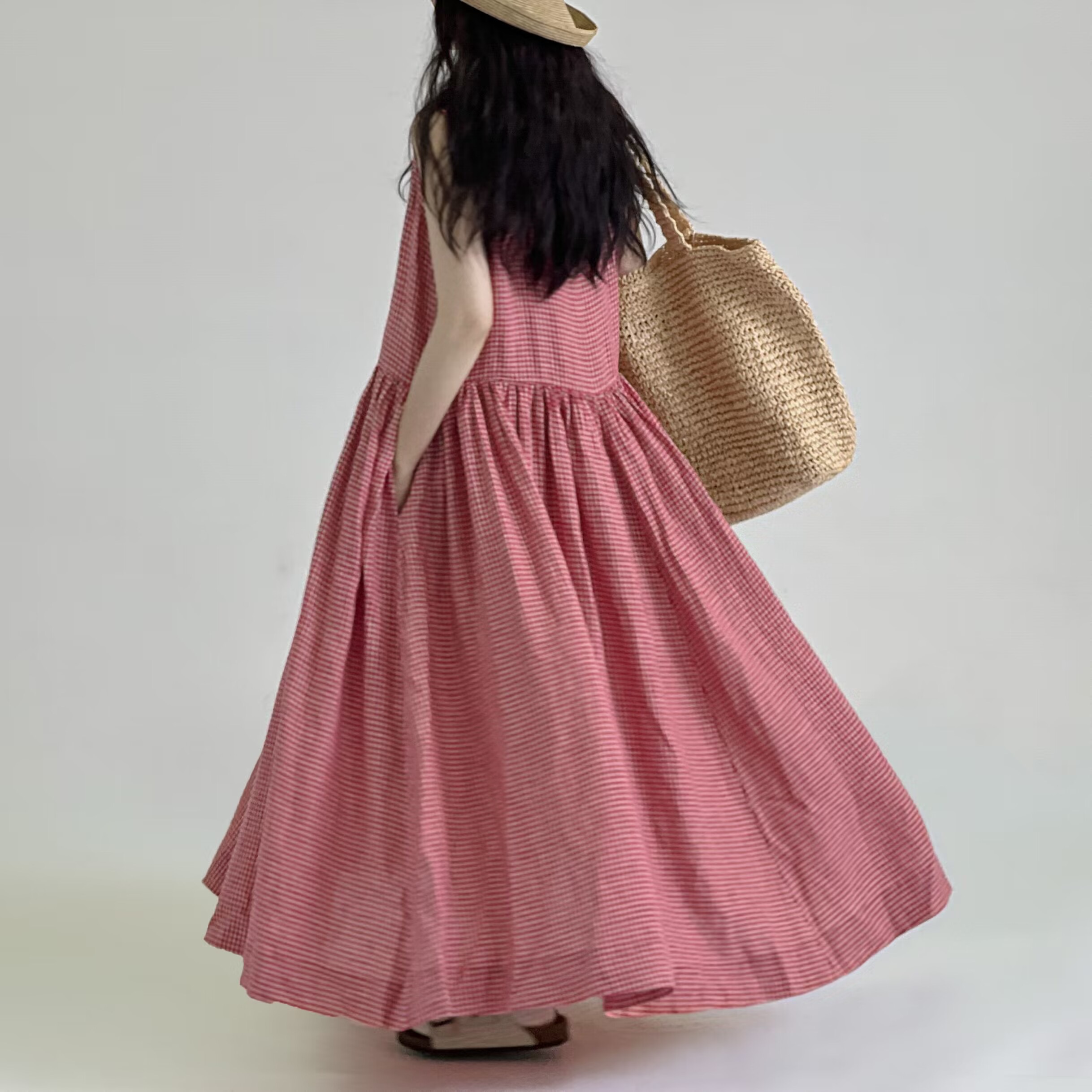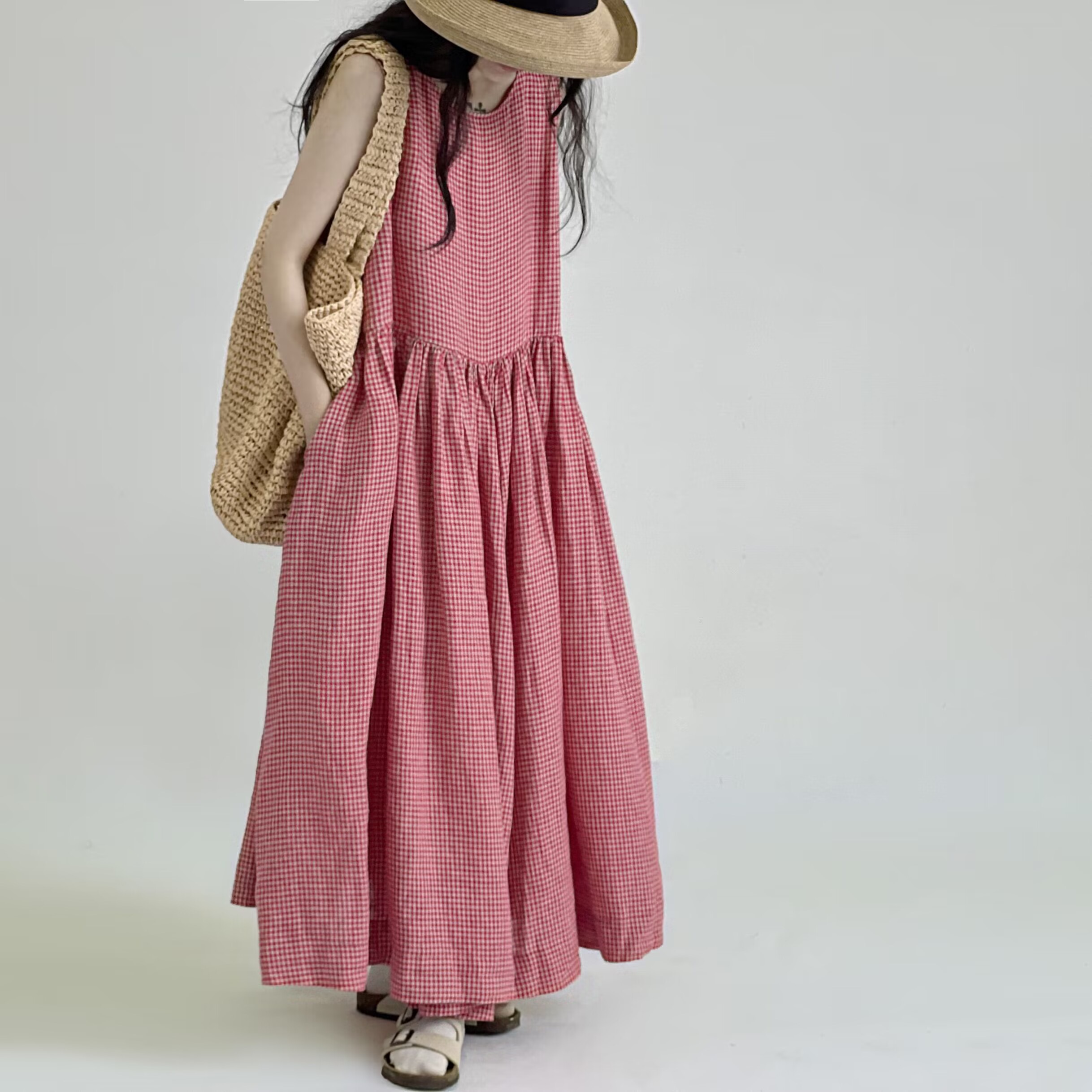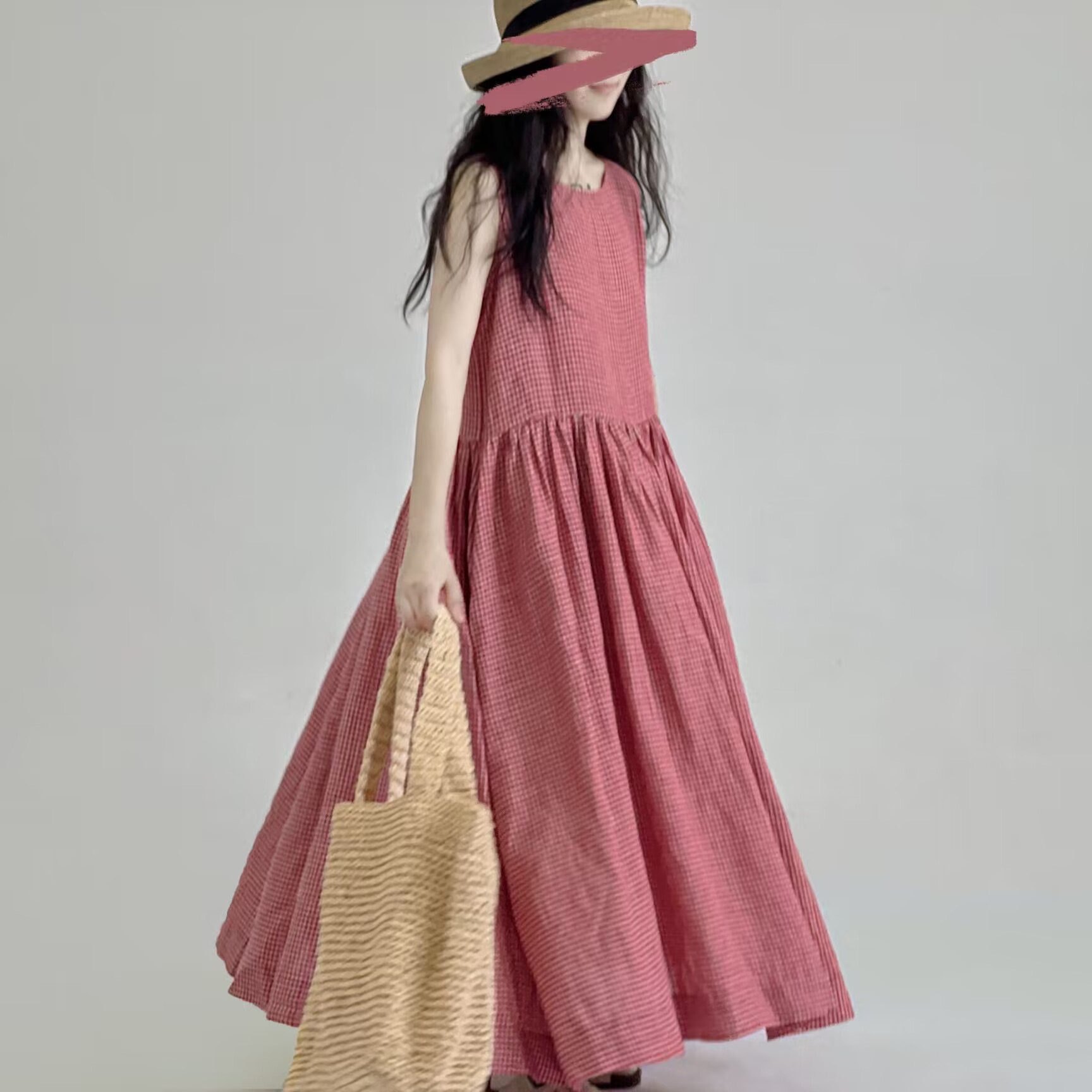 宽松文艺棉麻格子连衣裙女装夏季新款胖妹妹显瘦大摆a字背心长裙