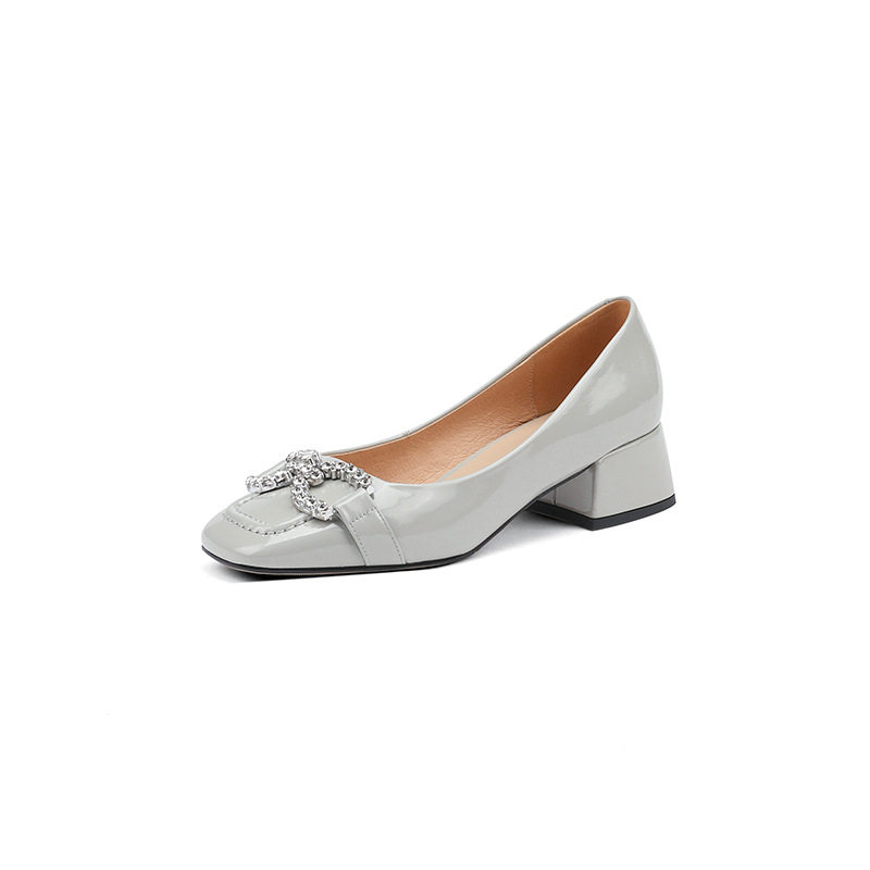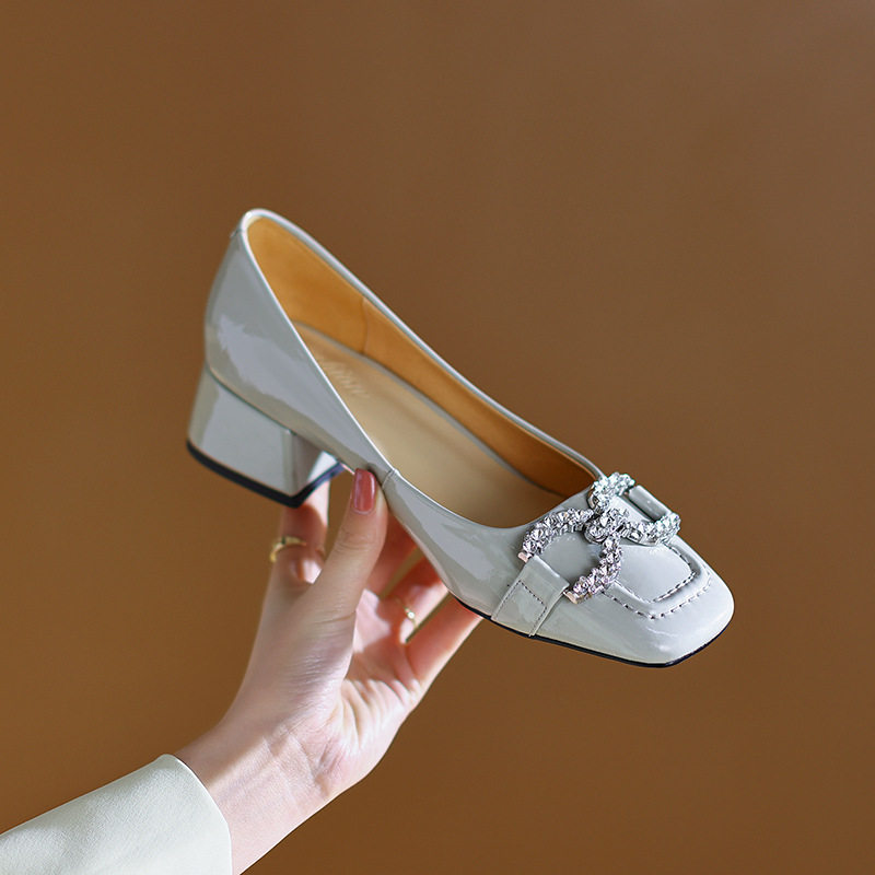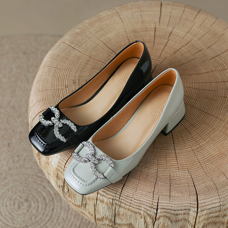 2024年新款春季百搭时尚真皮水钻方头单鞋女中跟粗跟浅口气质软皮