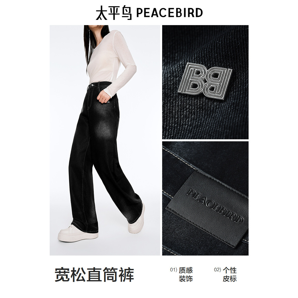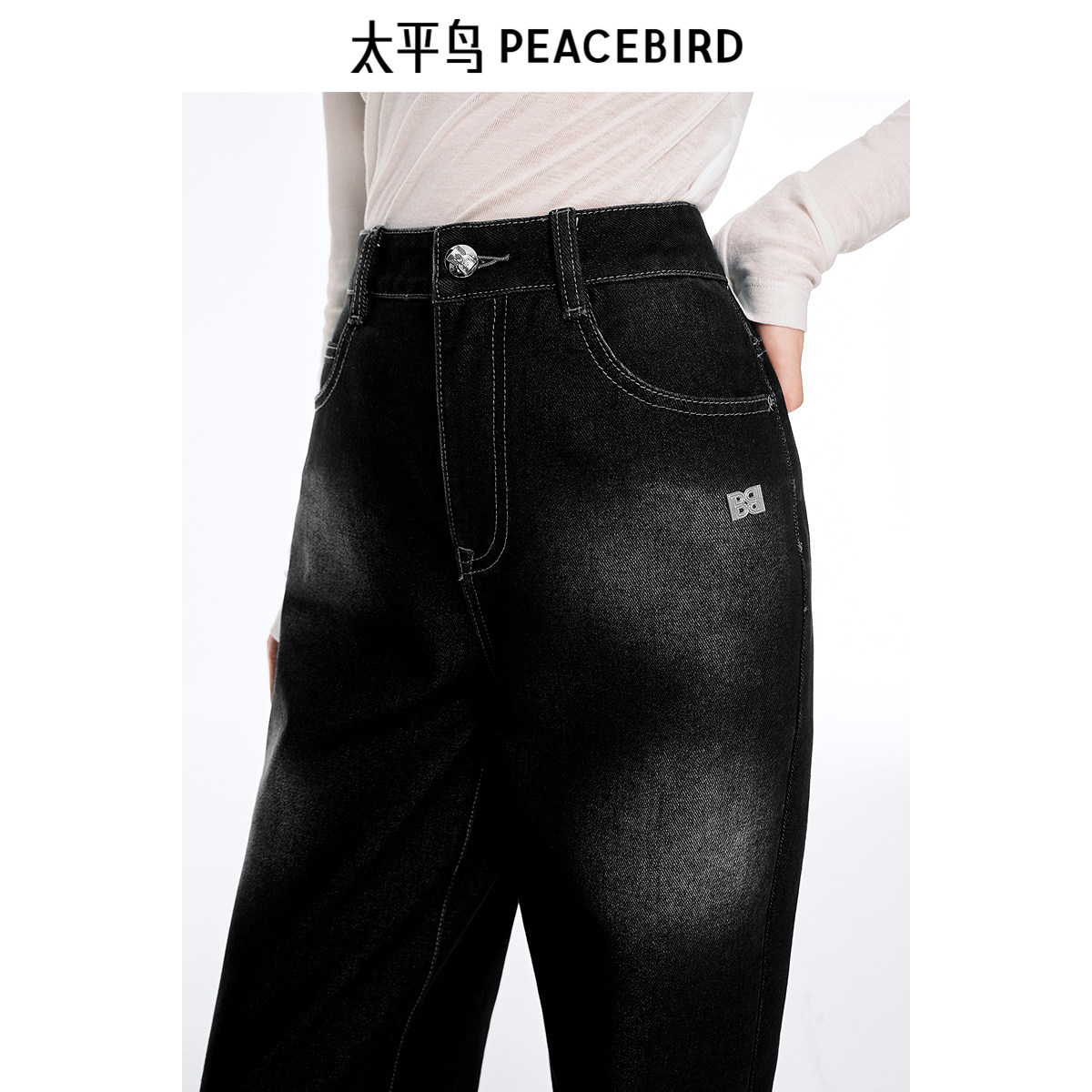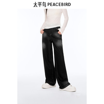 太平鸟复古高腰牛仔裤年夏季款宽松显瘦模糊洗水阔腿牛仔裤