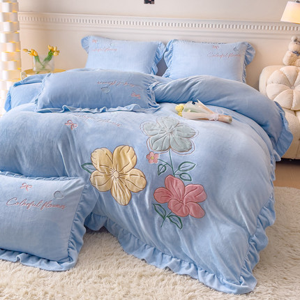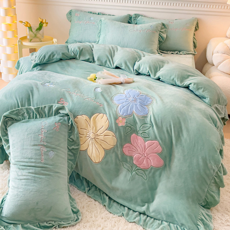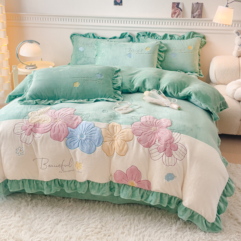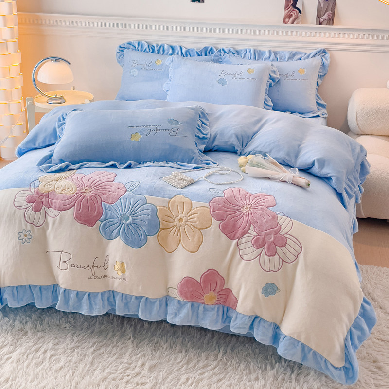 韩版加厚牛奶绒公主风花边四件套床单珊瑚被套加绒床上用品4件套