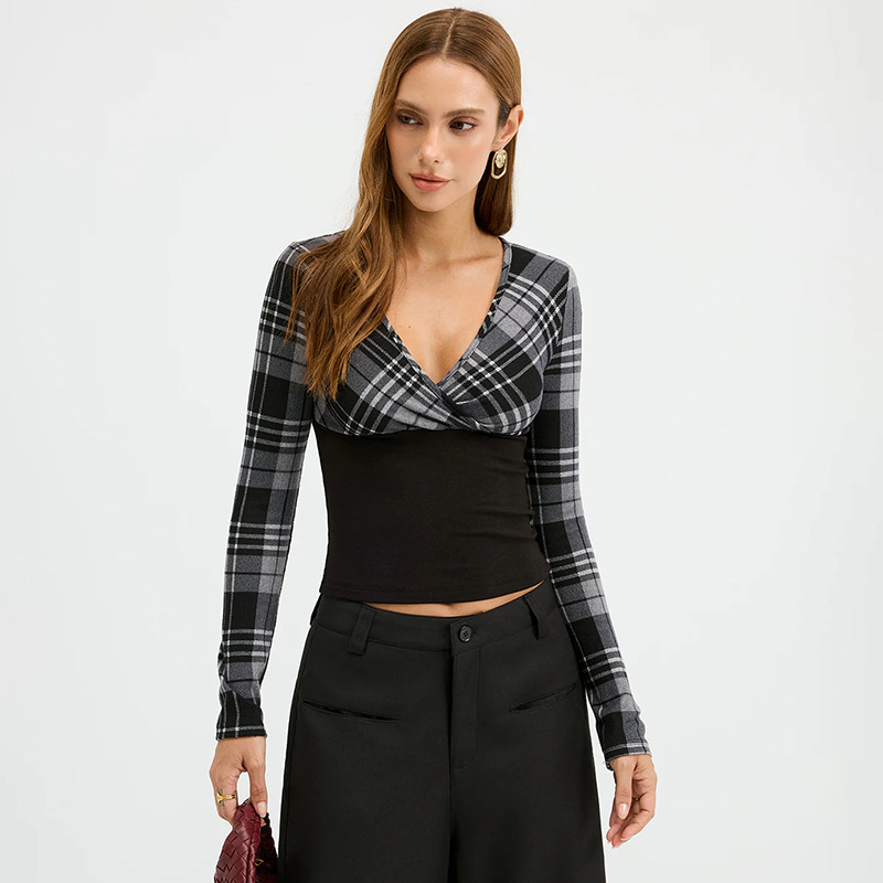 秋季新款百搭复古V领格纹拼接修身短款长袖上衣欧美法式内搭T恤女